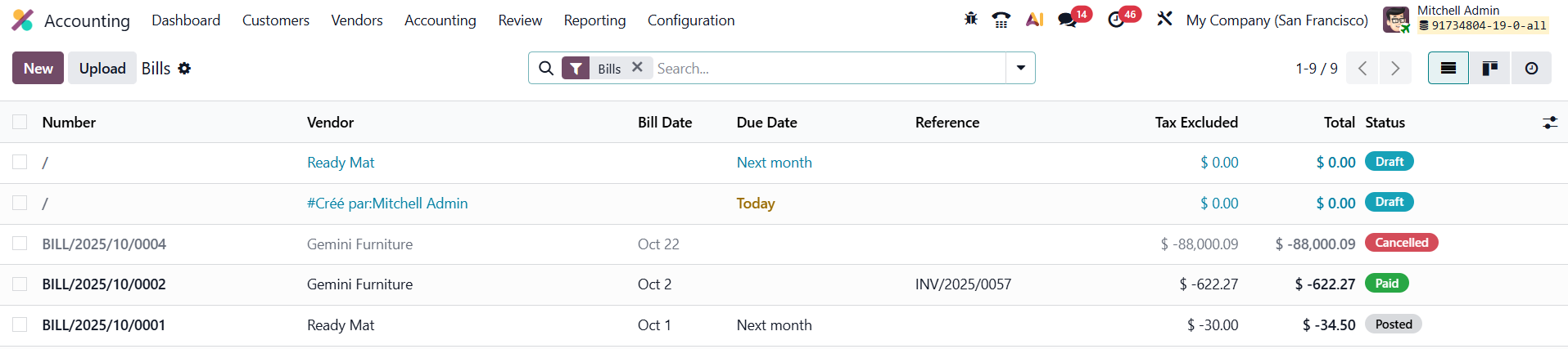 To manage vendor bills, users can either upload digital copies using the Upload button or create a new bill manually by clicking New.
