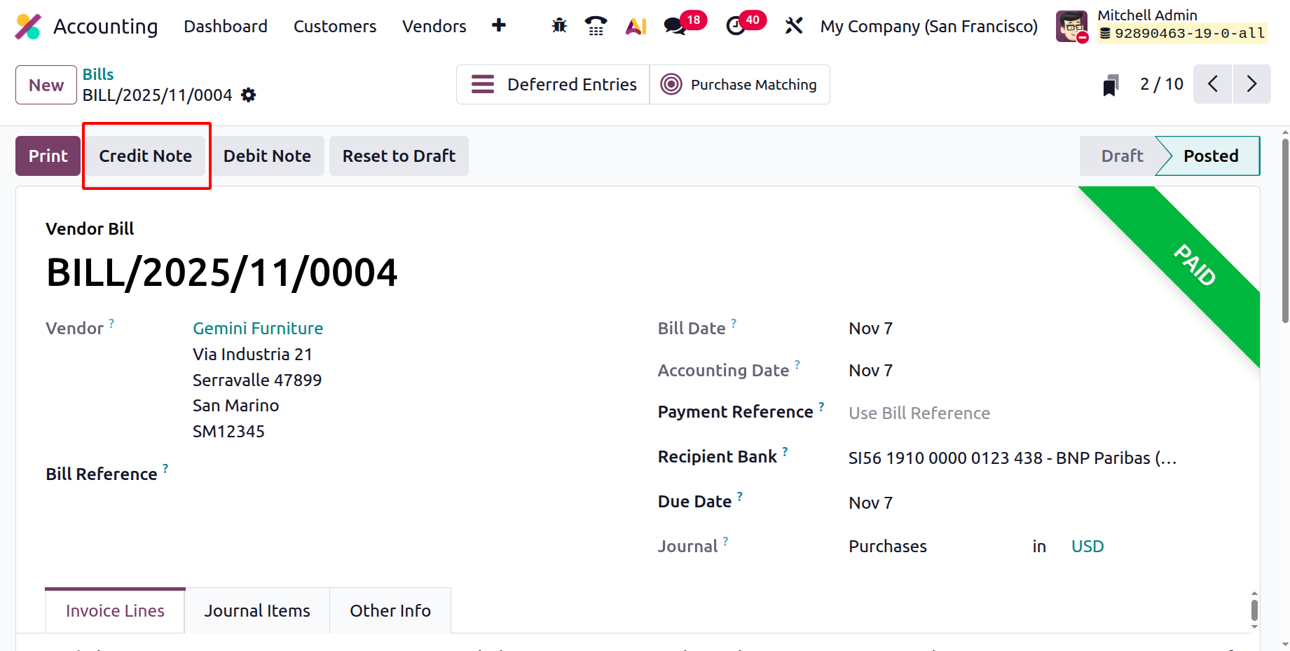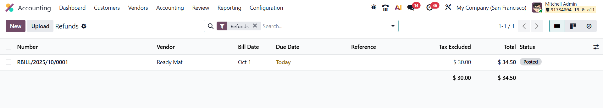 Within an existing vendor bill, the Add Credit Note button initiates the refund process, automatically creating a credit note that appears under the Refunds section.