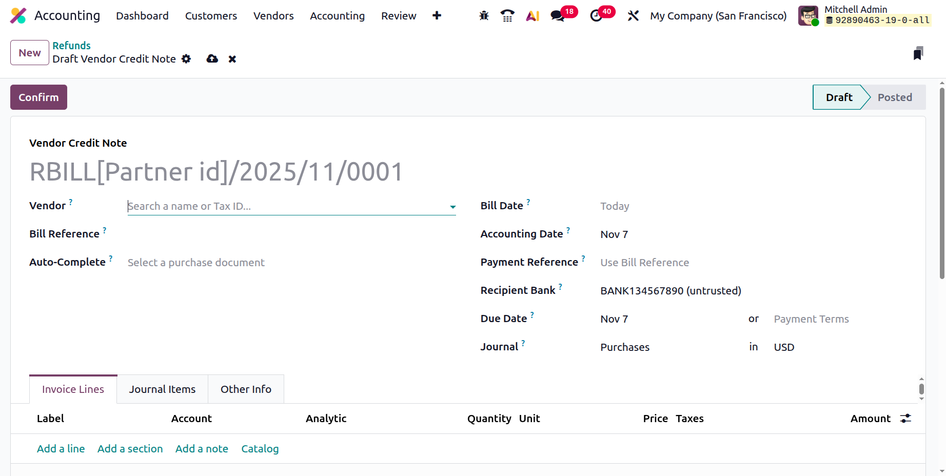 - Due Date: Automatically computed based on the payment terms associated with the vendor.