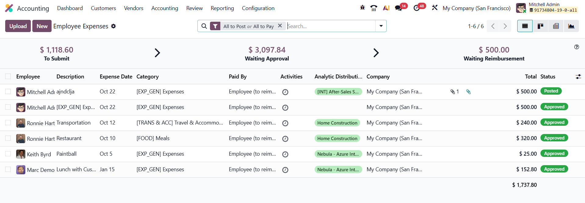 When you open the Employee Expenses section, you’ll find a well-structured list view displaying crucial information such as the Employee Name, Description, Expense Date, Category, Paid By, Analytic Distributions, Company, Activities, Total, and Status. This helps finance teams maintain a clear overview of all ongoing expense reports.