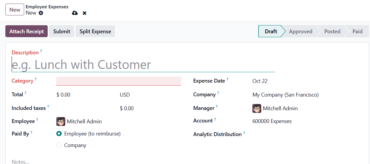 The Description field is used to enter a brief yet clear summary of the expense, for example, “lunch with client” or “hotel for conference.” Next, the Category field allows the user to select the most relevant expense category from the drop-down list, such as travel, meals, or accommodation. The Total field records the full amount spent on the expense. Any Included Taxes configured in the selected category are automatically applied and displayed beneath the total amount.