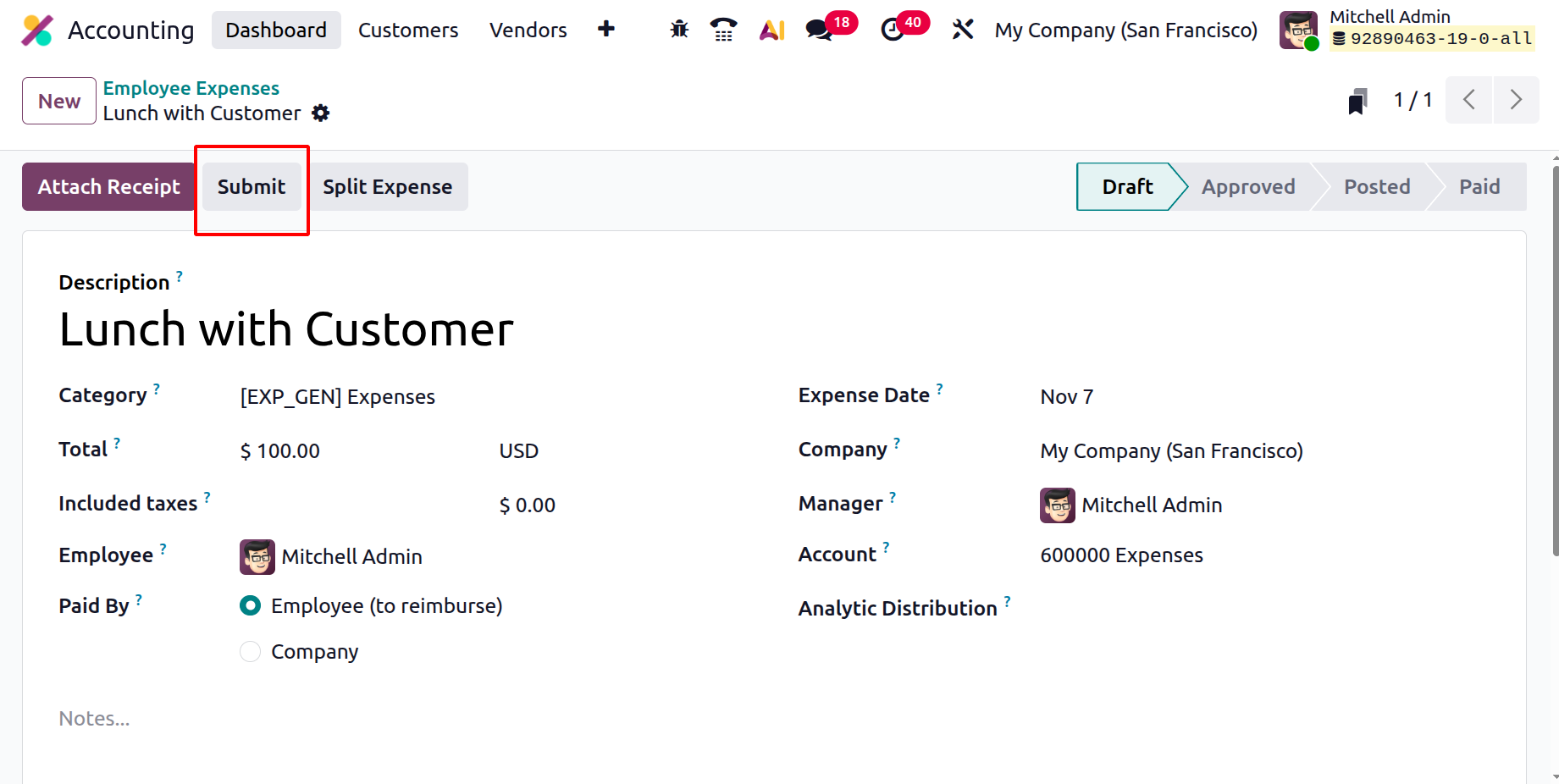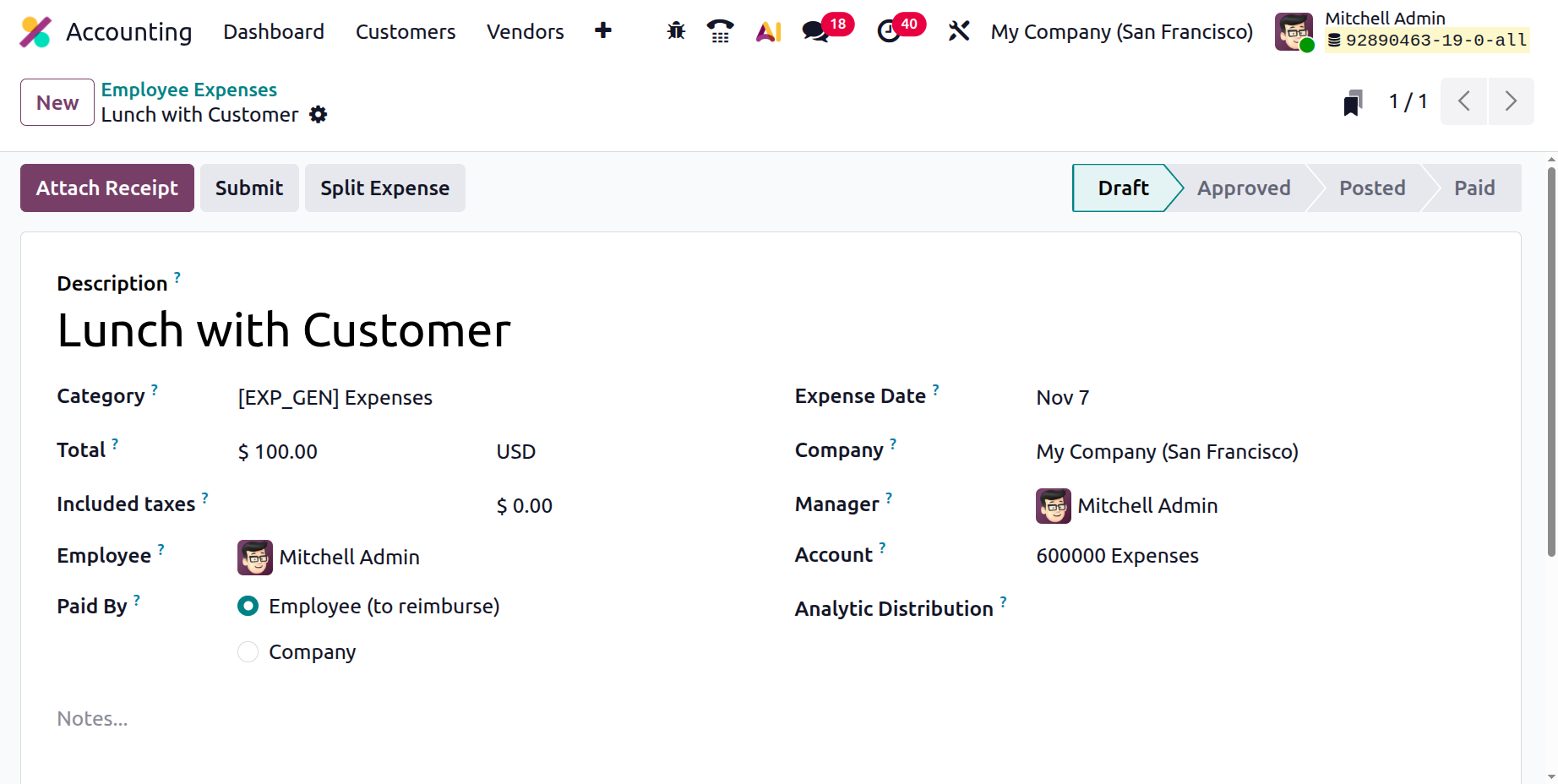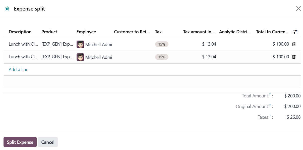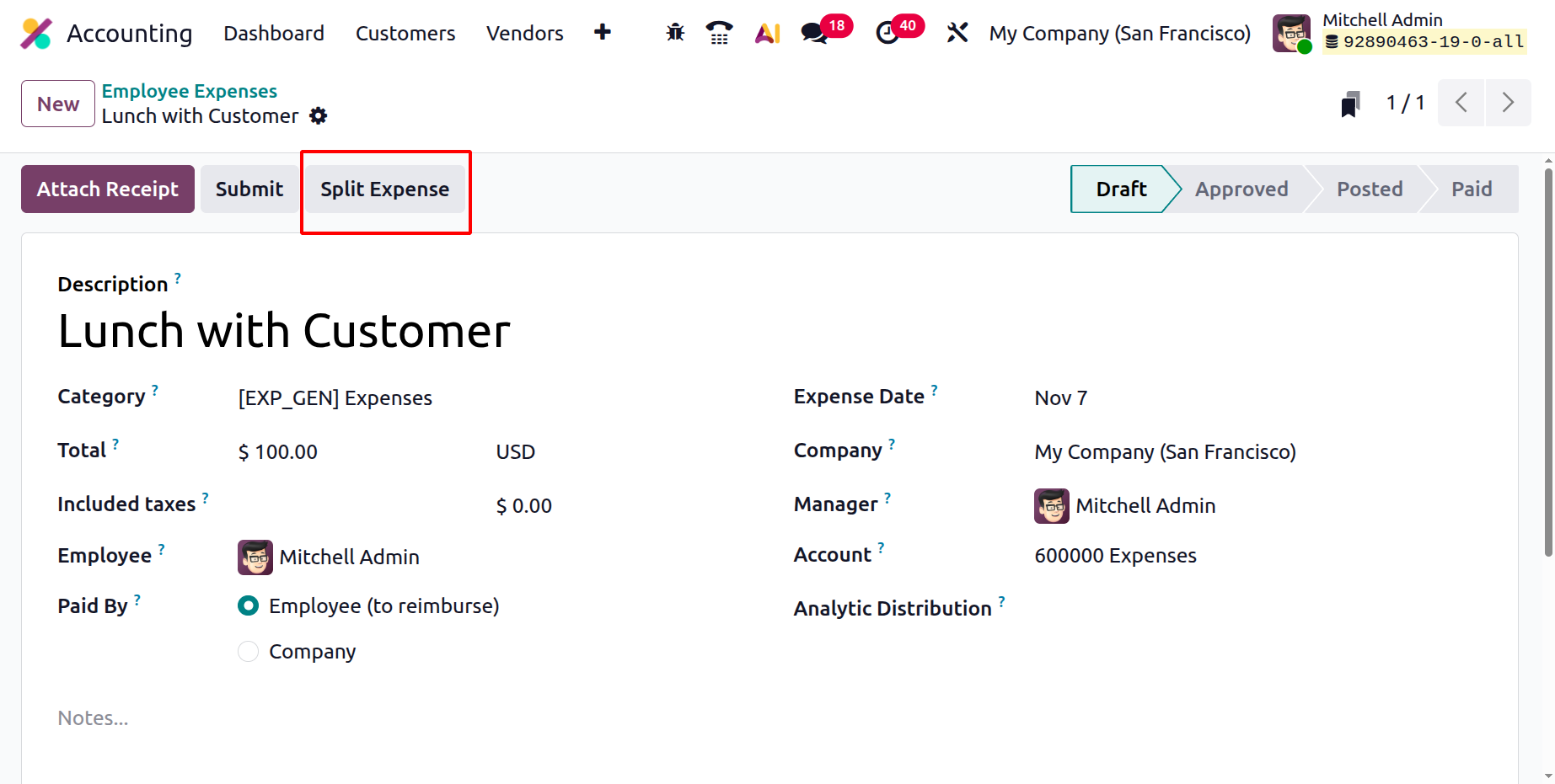 If an expense needs to be allocated across multiple categories or projects, the Split Expense option in Odoo 19 Accounting can be used. This feature allows users to break a single expense into multiple line items.