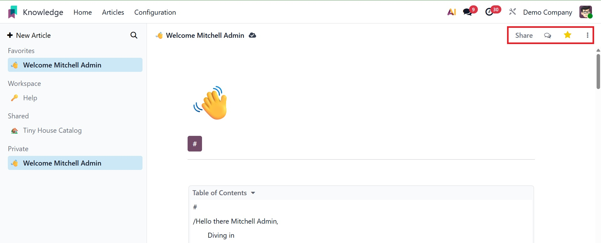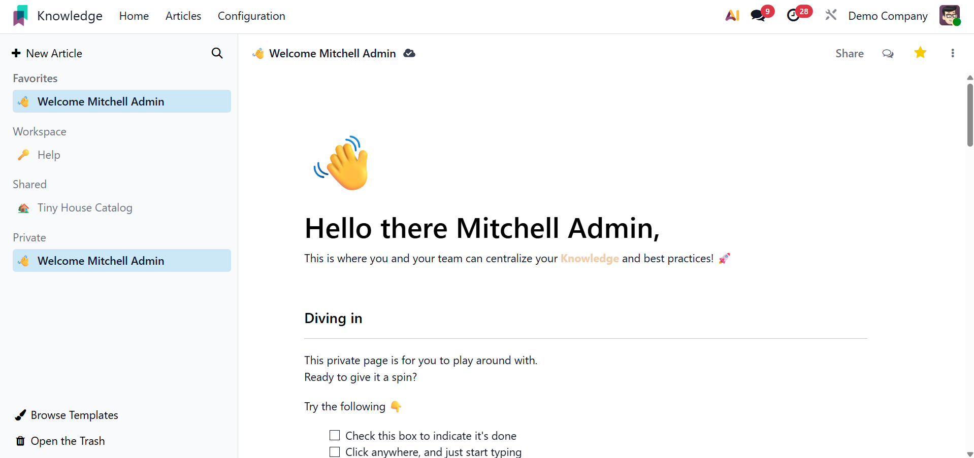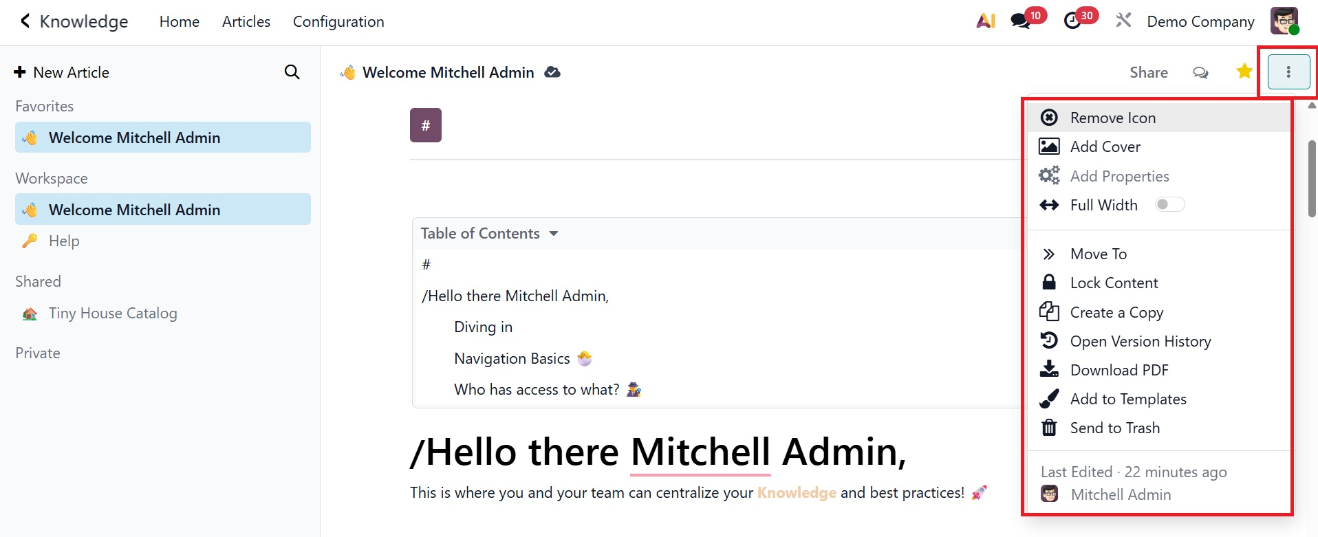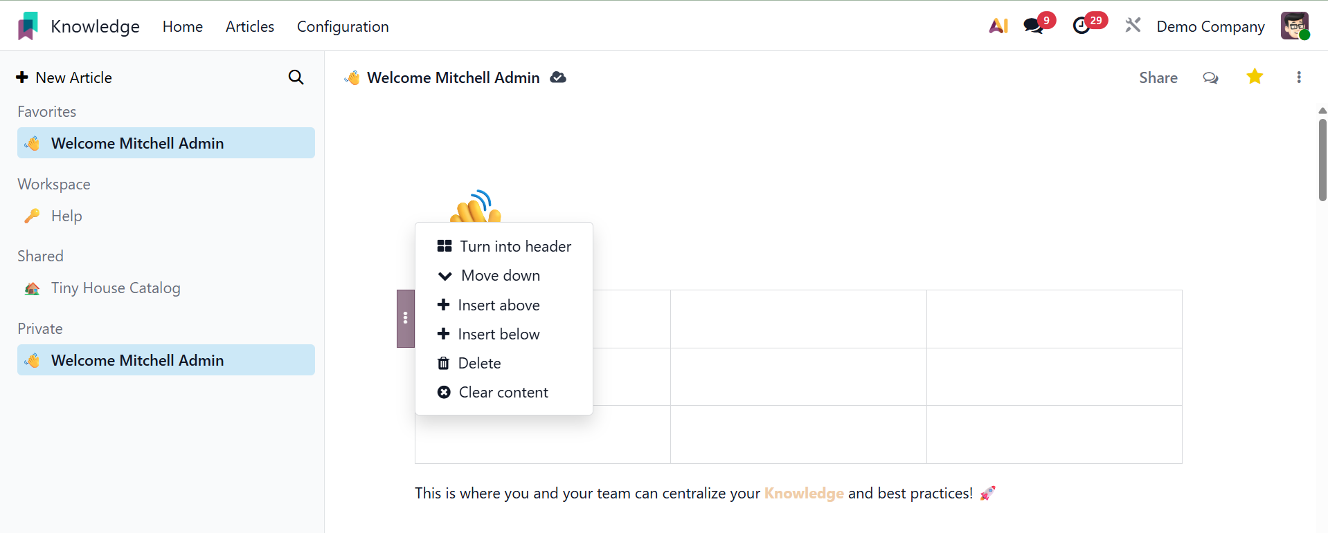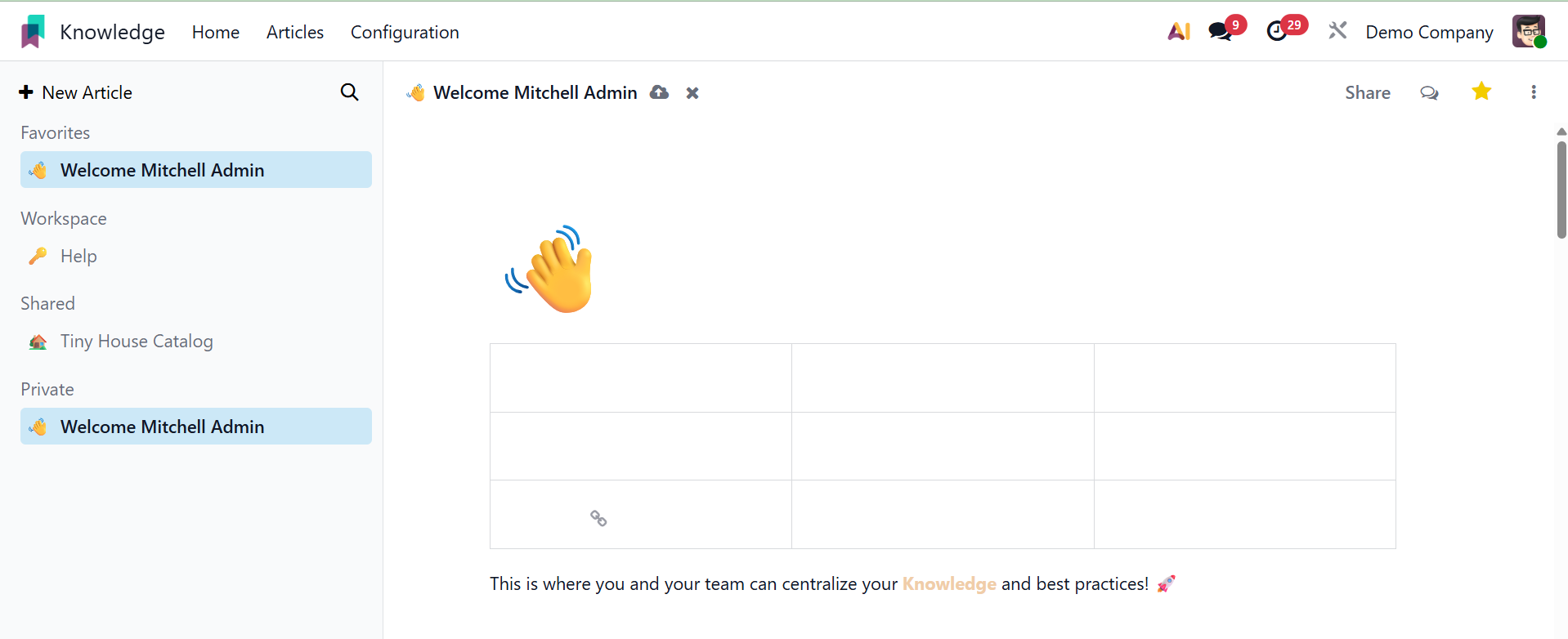 You can easily and methodically produce and share information with your colleagues using Odoo 19's new knowledge management system.