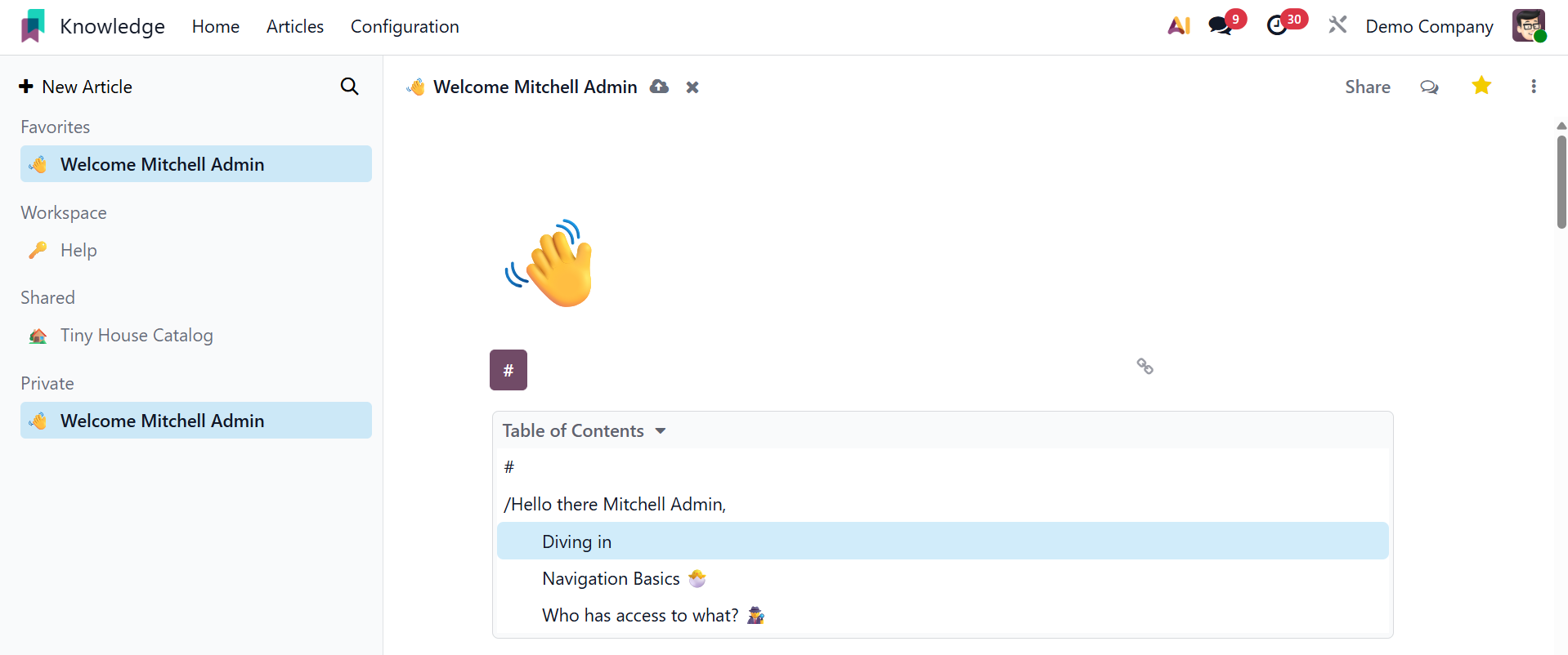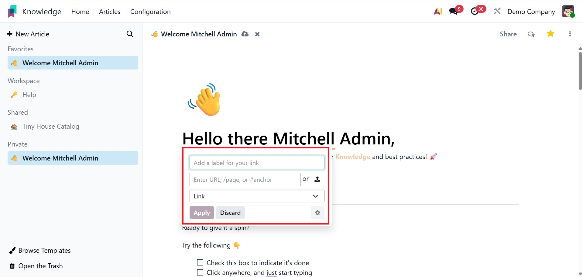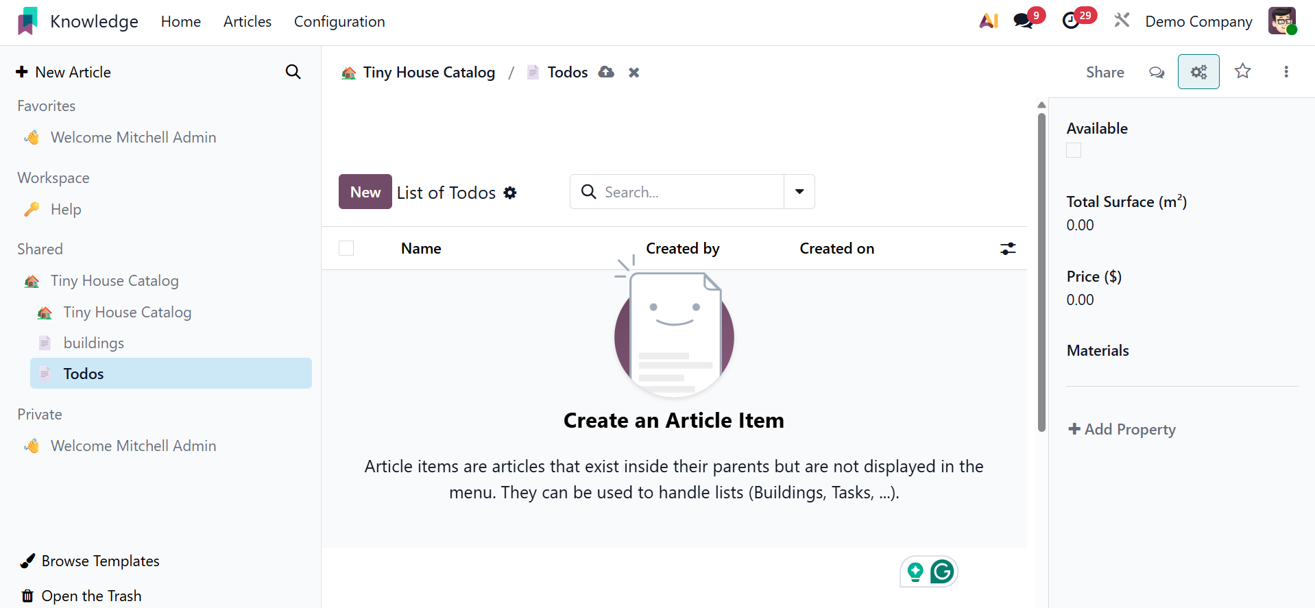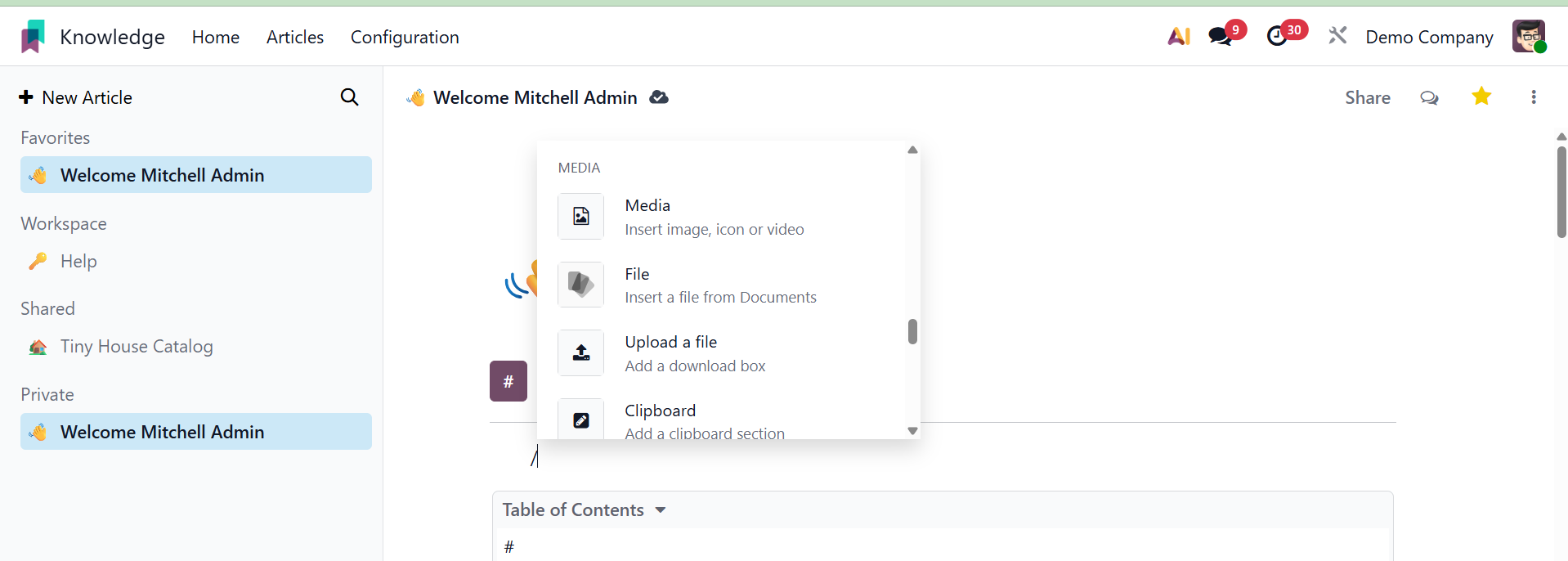 You can easily and methodically produce and share information with your colleagues using Odoo 19's new knowledge management system.