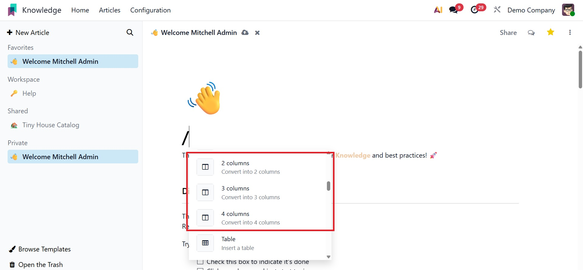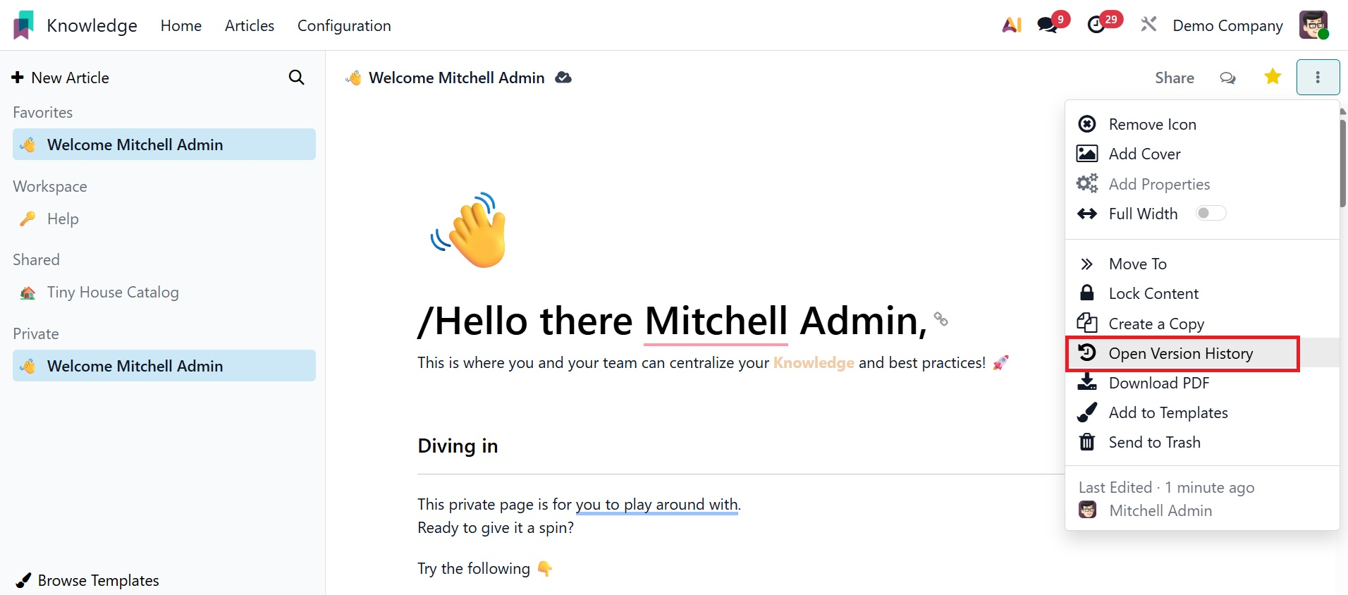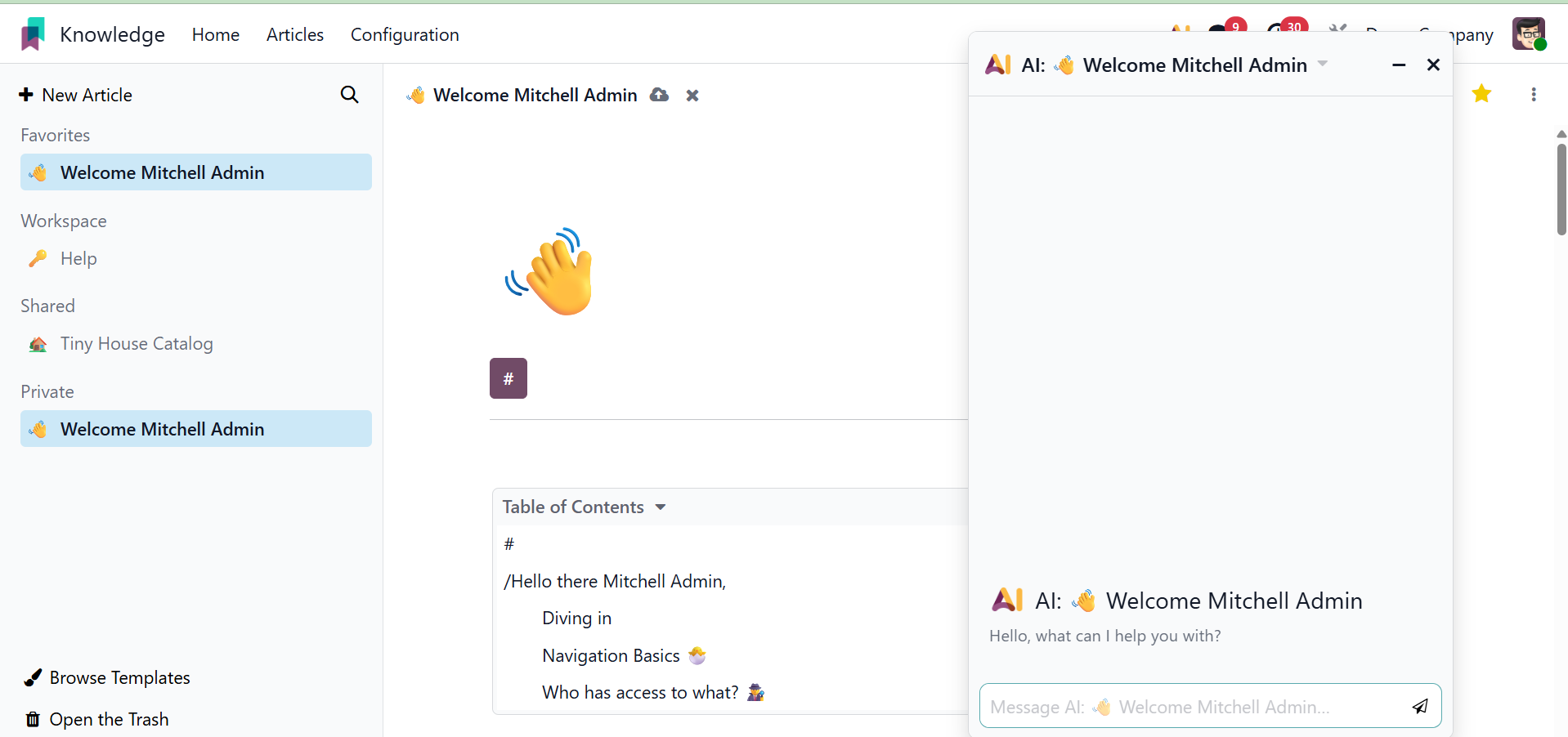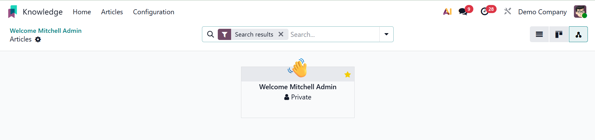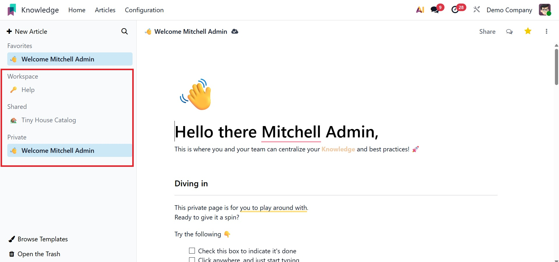 You can easily and methodically produce and share information with your colleagues using Odoo 19's new knowledge management system.
