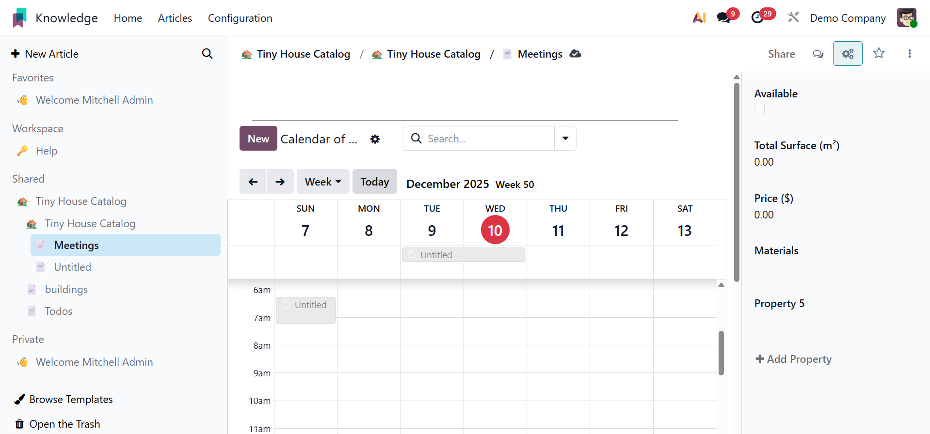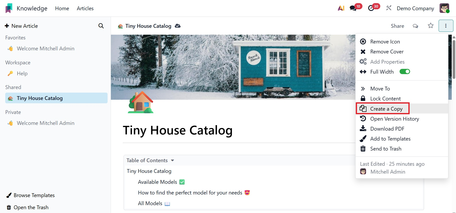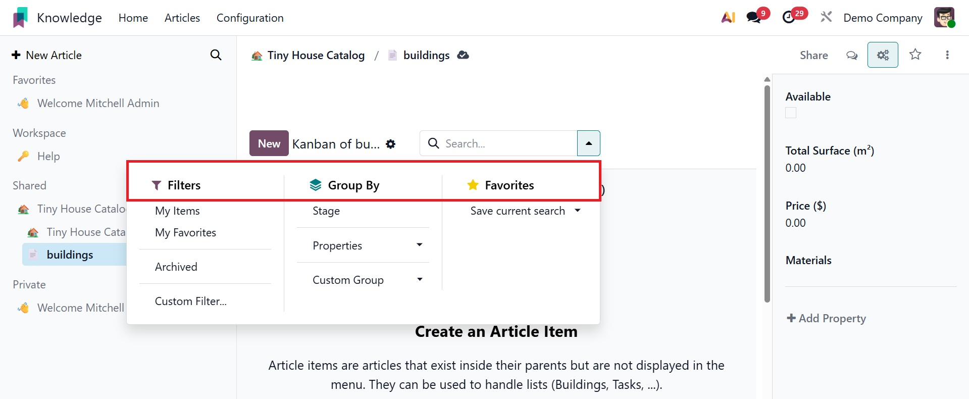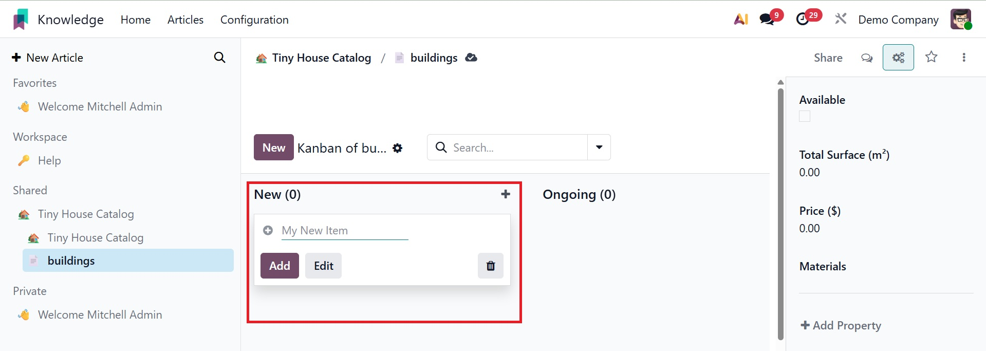 You can easily and methodically produce and share information with your colleagues using Odoo 19's new knowledge management system.