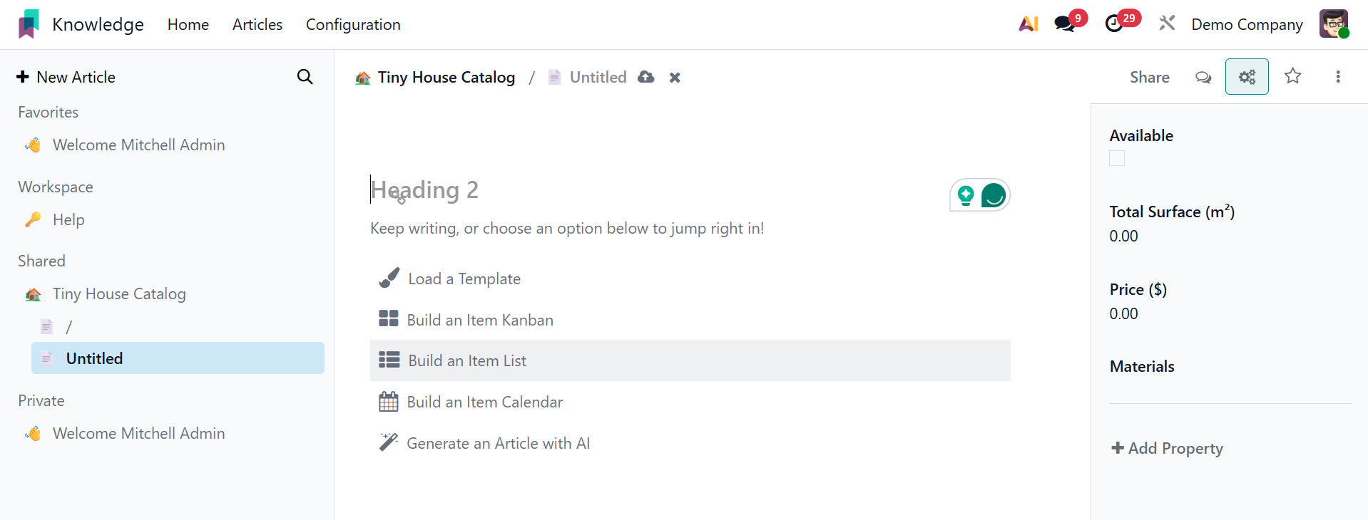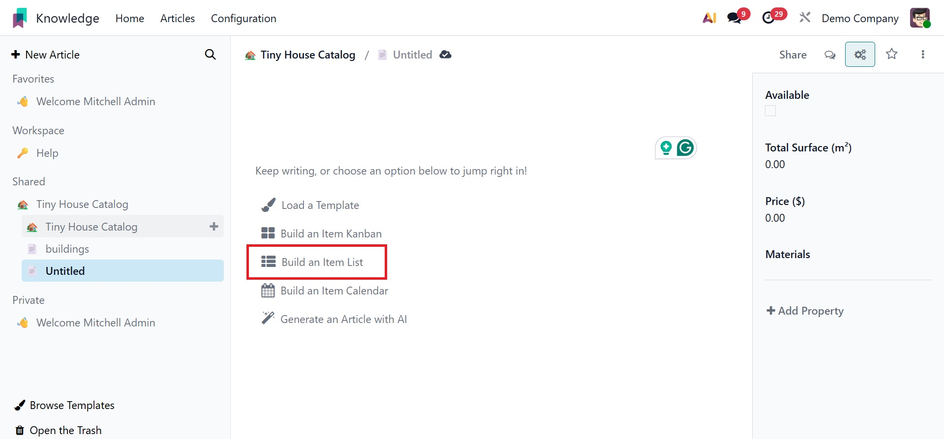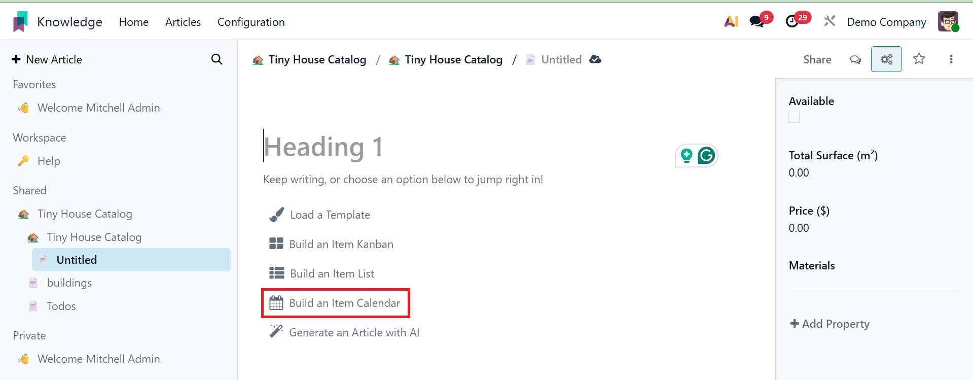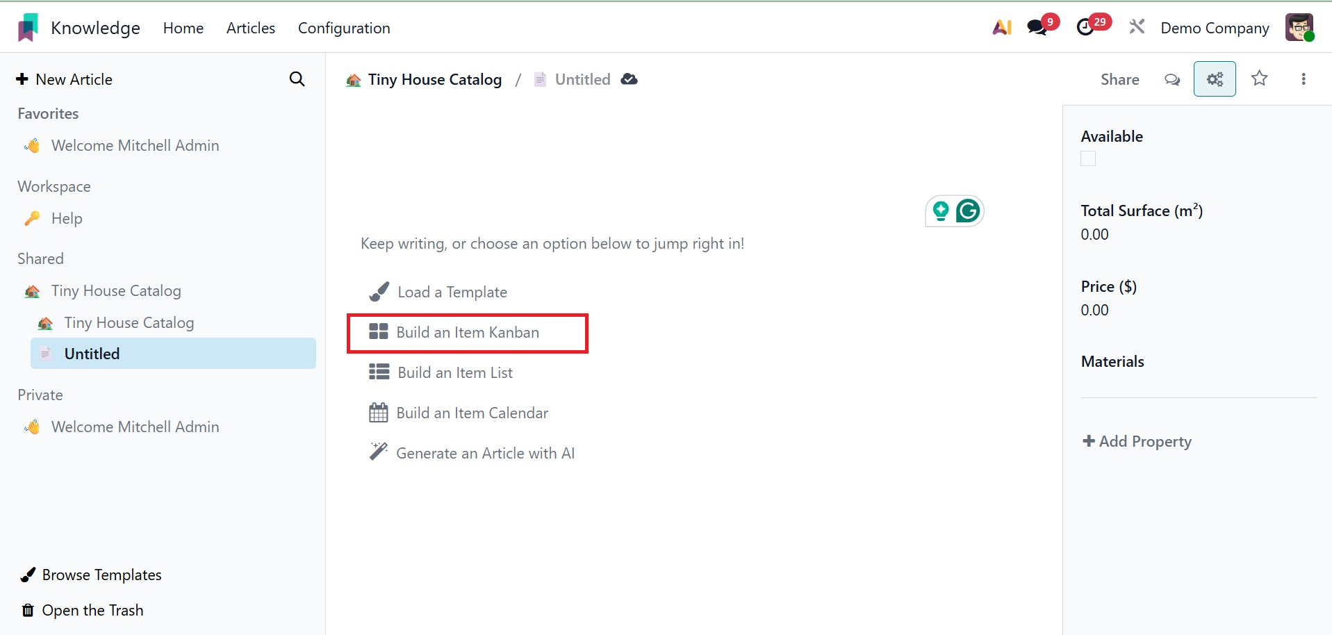 This box allows you to create a new article based on your requirements. Within the article box, users can add other features. Here are a few of them: Load a Template, Build an Item Calendar, Build an Item Kanban, Generate an Article with AI, and Build an Item list.