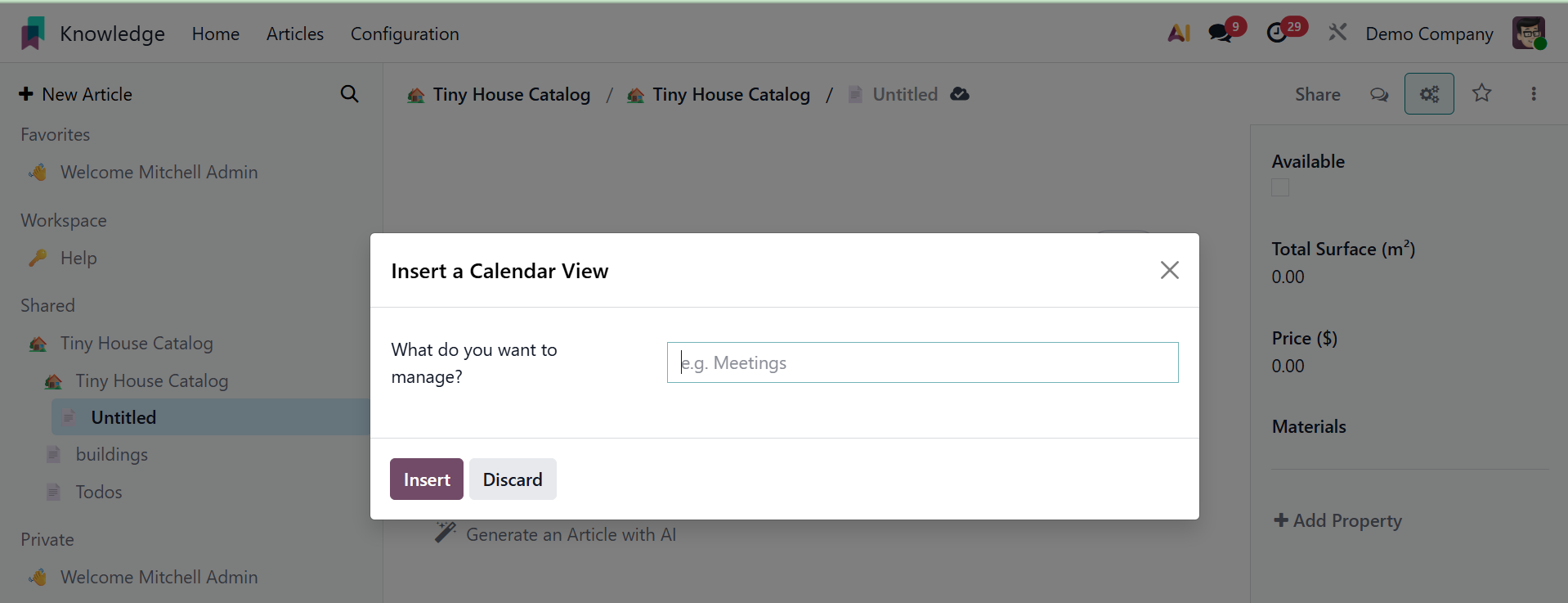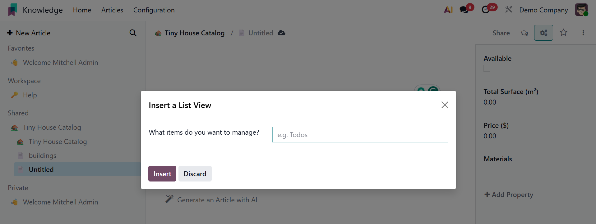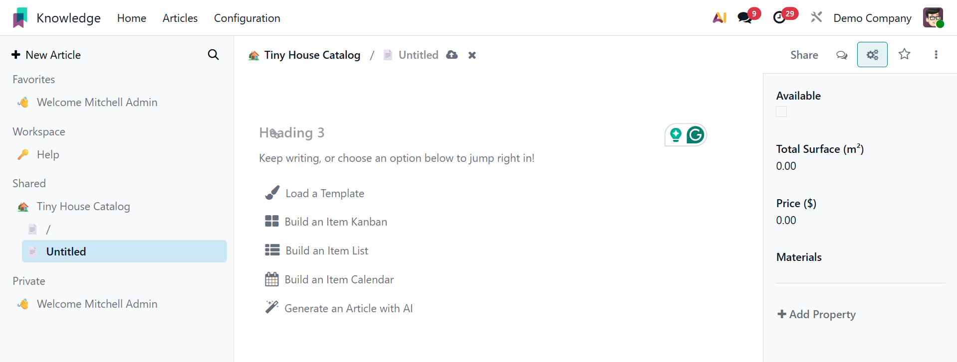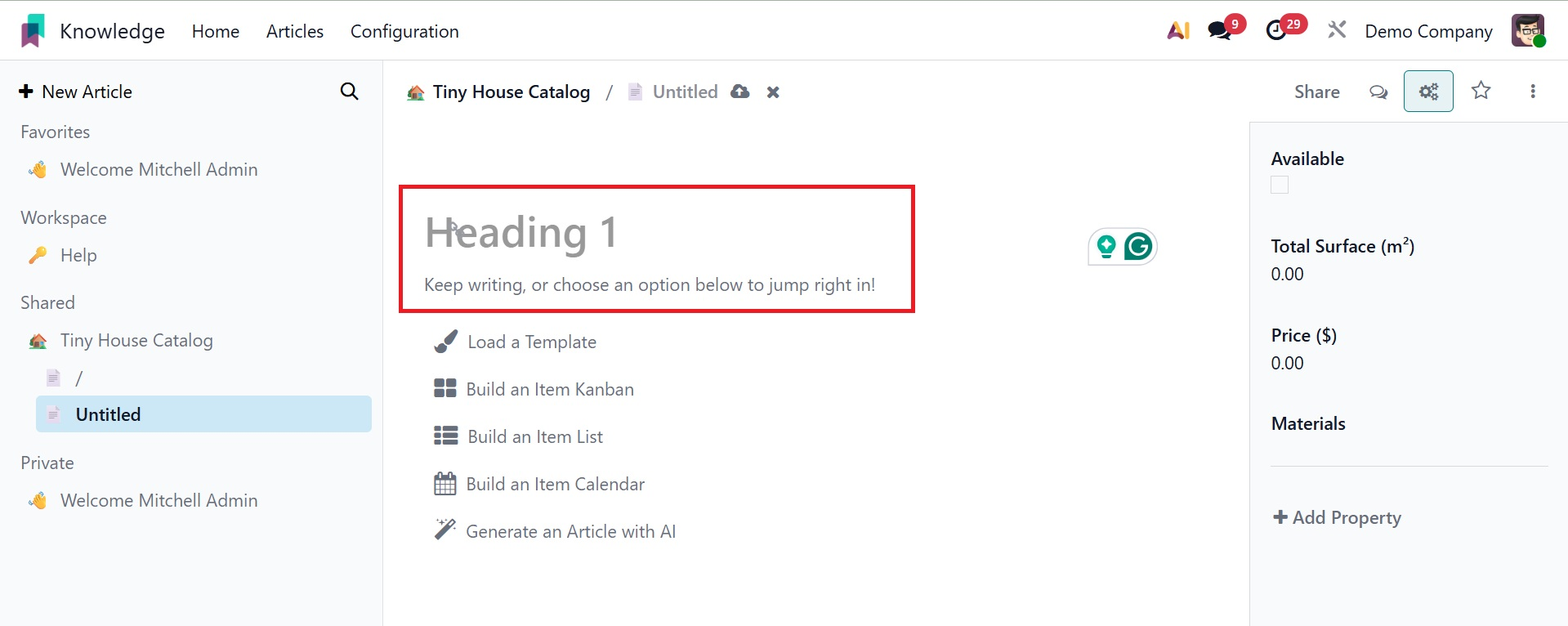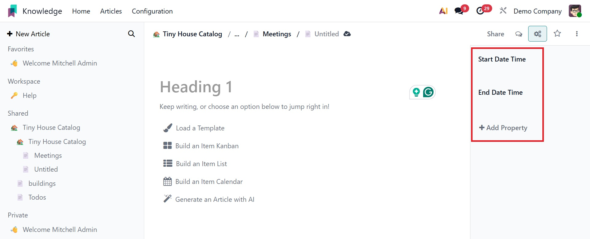 This box allows you to create a new article based on your requirements. Within the article box, users can add other features. Here are a few of them: Load a Template, Build an Item Calendar, Build an Item Kanban, Generate an Article with AI, and Build an Item list.