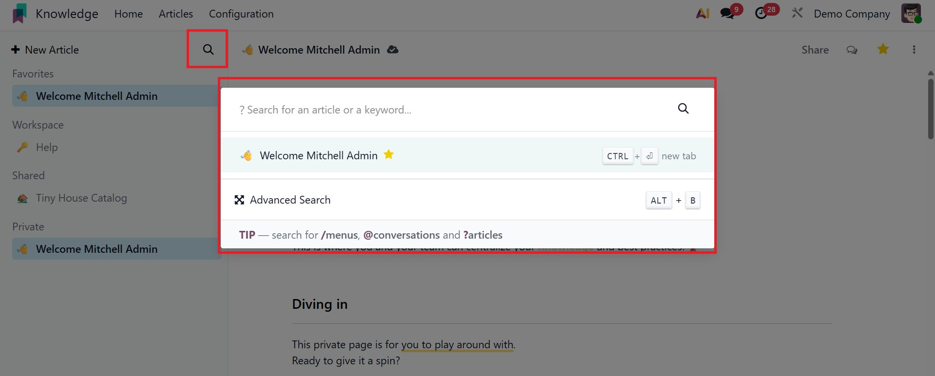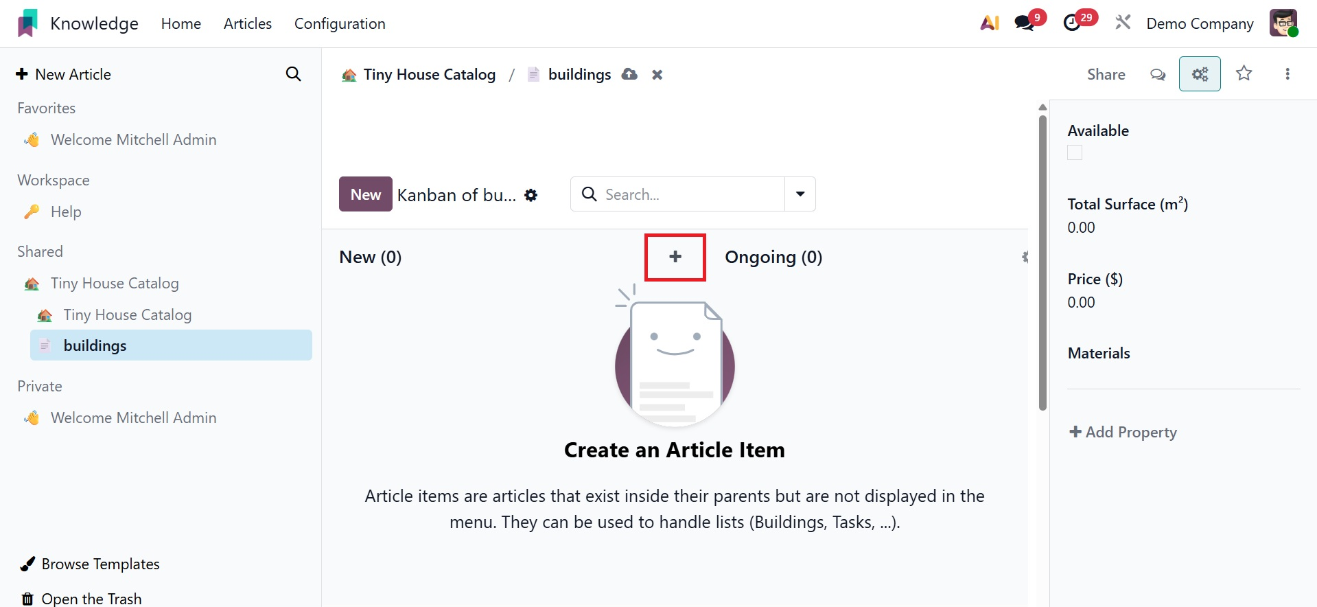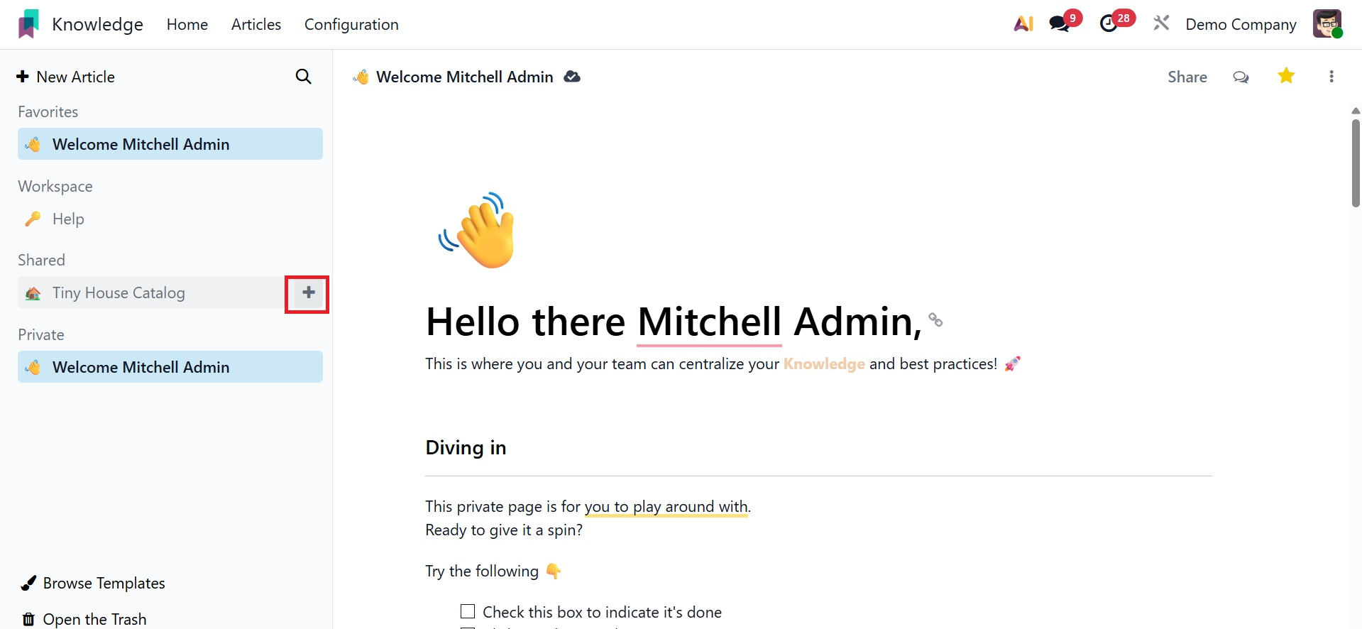 Everything is well-organized in this module. Move your cursor close to the Workspace menu to start a new article for your workspace. As you can see below, a plus icon will show up, opening a new window where you may start creating a new article.