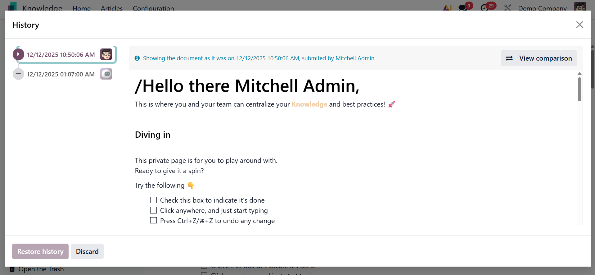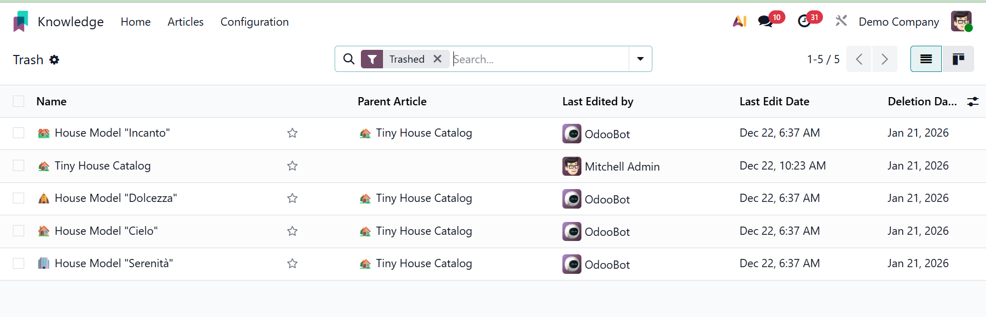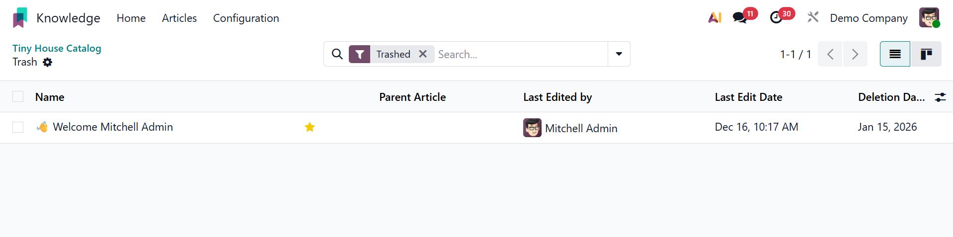 Authorized users can examine, restore, or permanently erase items from the Knowledge workspace using the Trashed option found in the Odoo Knowledge module's Configuration menu.