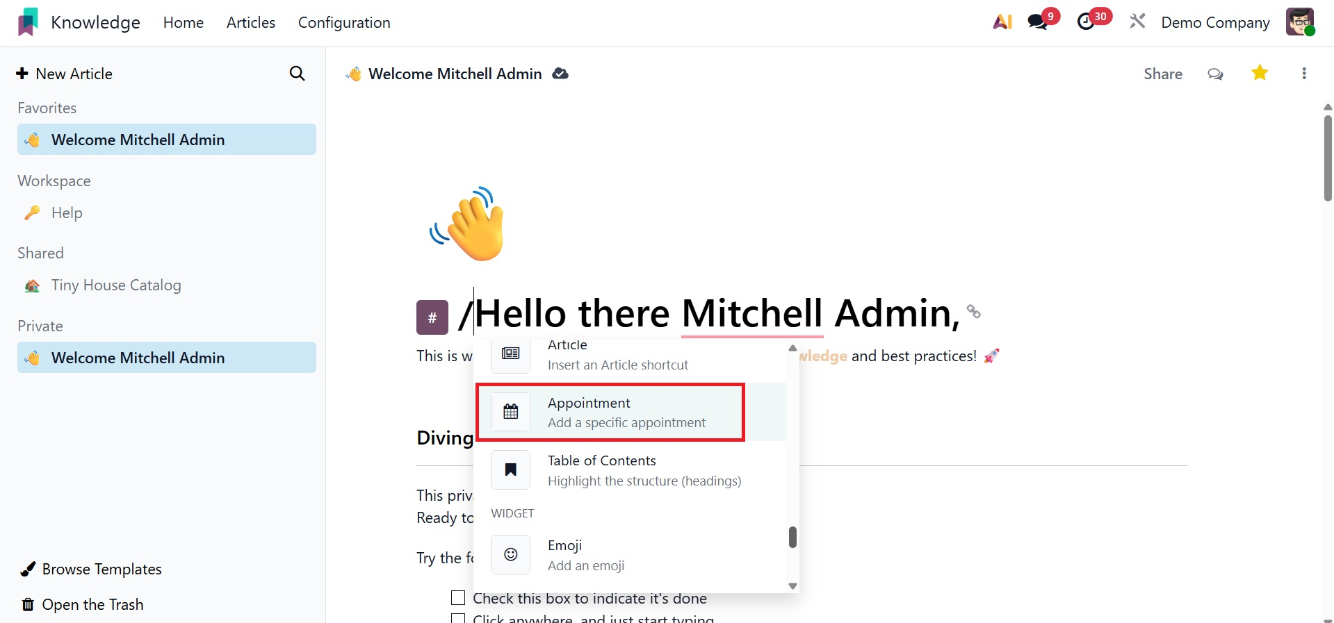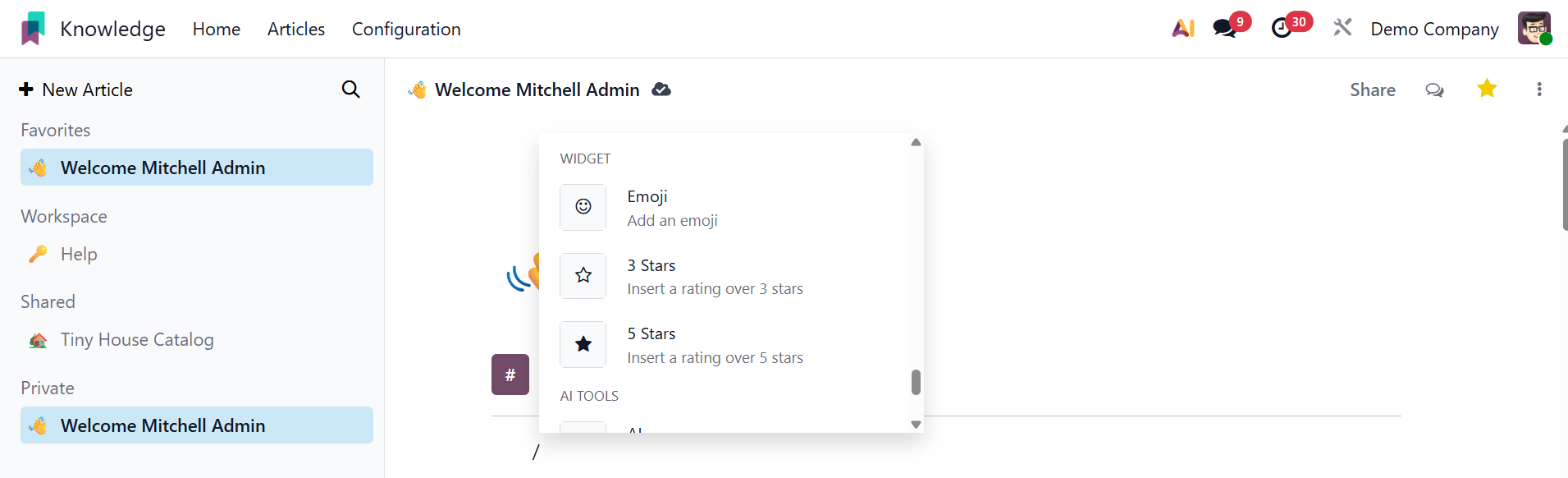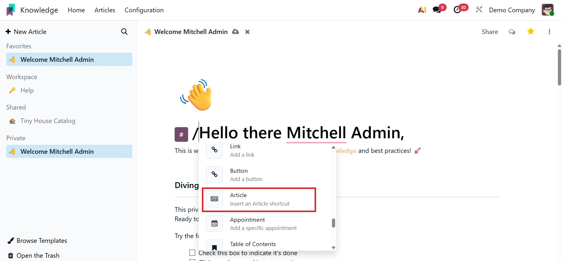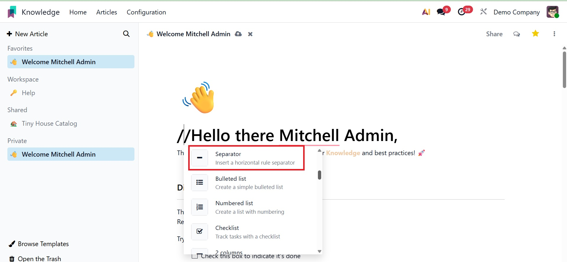 Odoo 19 consistently incorporates intriguing features for consumers with the release of its latest version. Odoo has evolved over the past few years to offer the fastest processing speeds and improved integration for handling multiple business activities simultaneously. The most recent addition to Odoo 19, the Knowledge module, will make it easier for employees to create and share articles and papers. This highly integrated module facilitates effective internal communication by acting as a knowledge source where staff members can exchange their expertise. This module allows you to write and distribute a range of articles and work-related content.