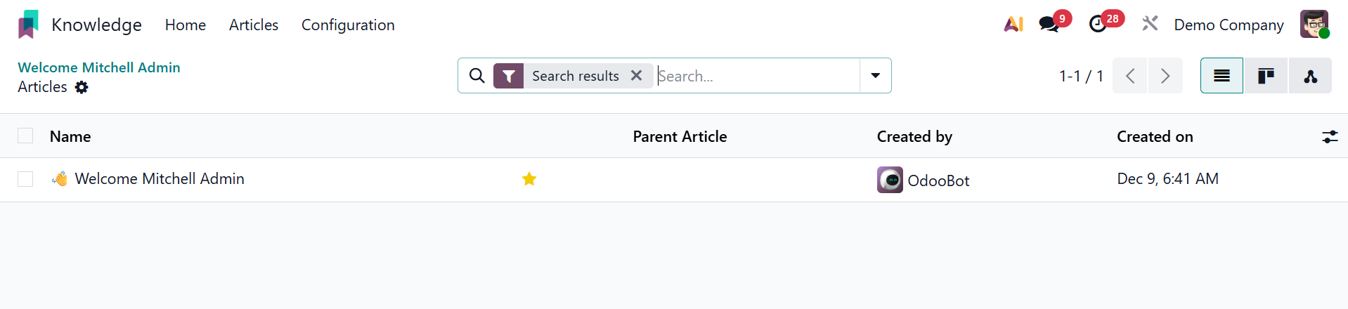 The articles' Name, Parent Article, Created By, and Created on details are displayed in the list view. By choosing the Search option from the module's main menu bar, you can open this window.