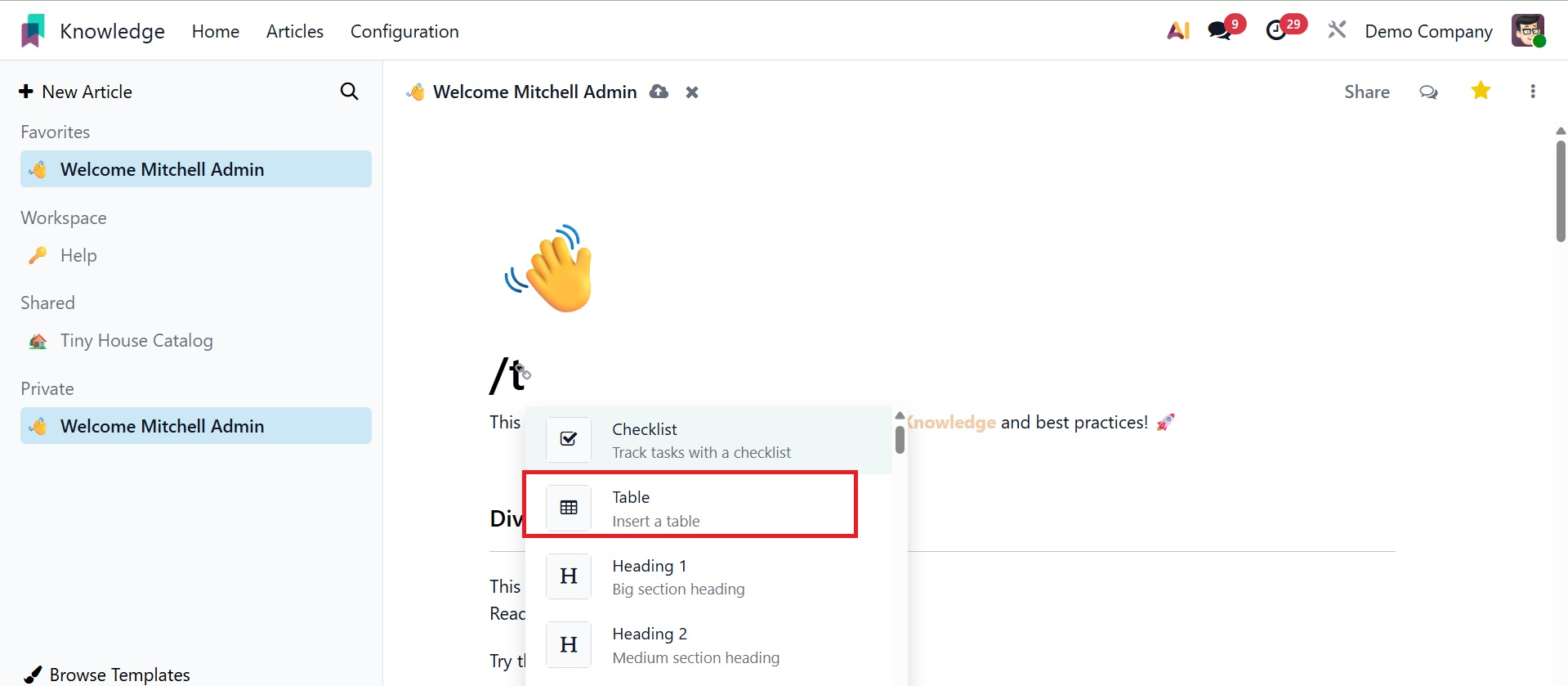 Table: Since some information should be recorded in a tabular format, a table is an additional tool for adding a table with rows and columns to your content. Adding a table to the article is made easier with the help of the '/' table.