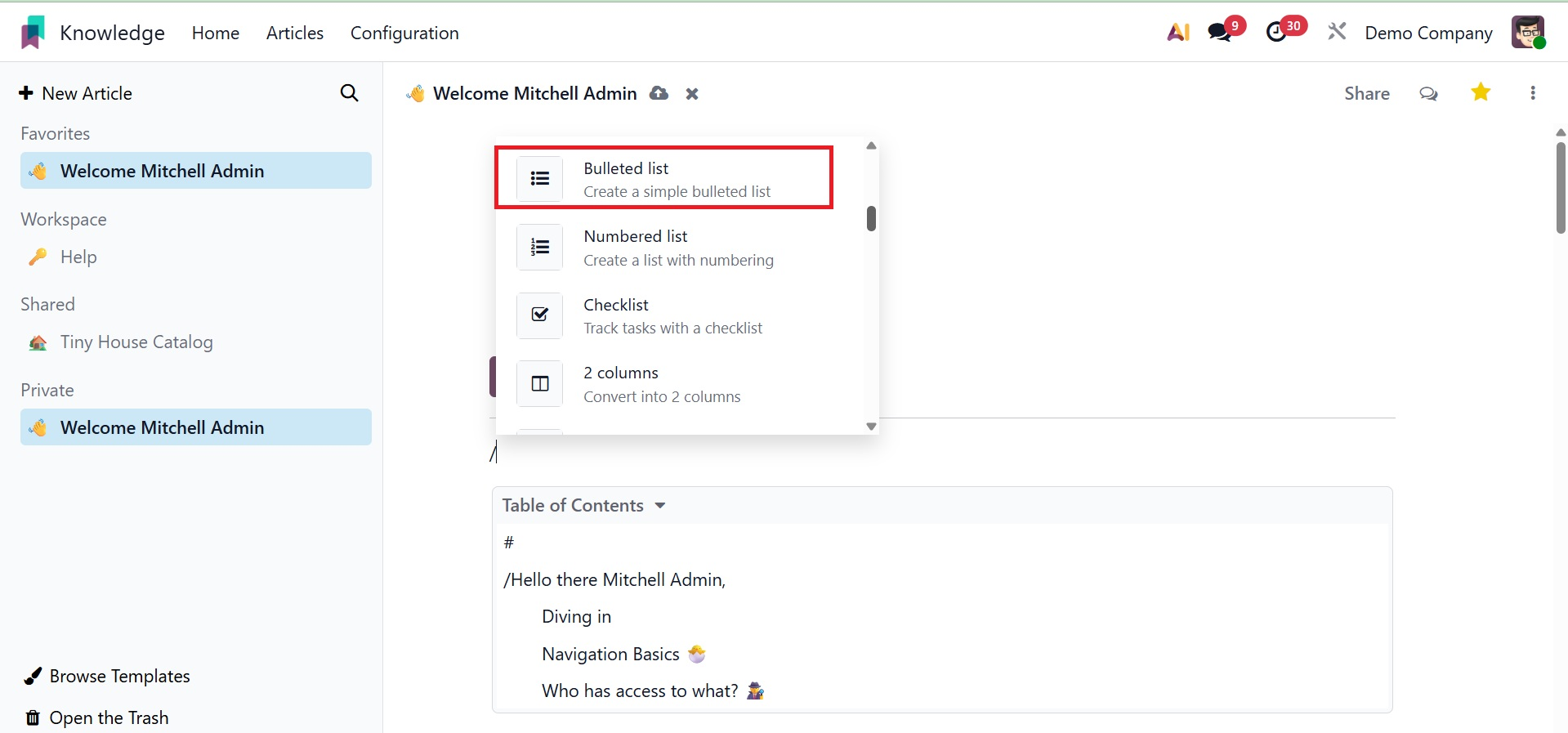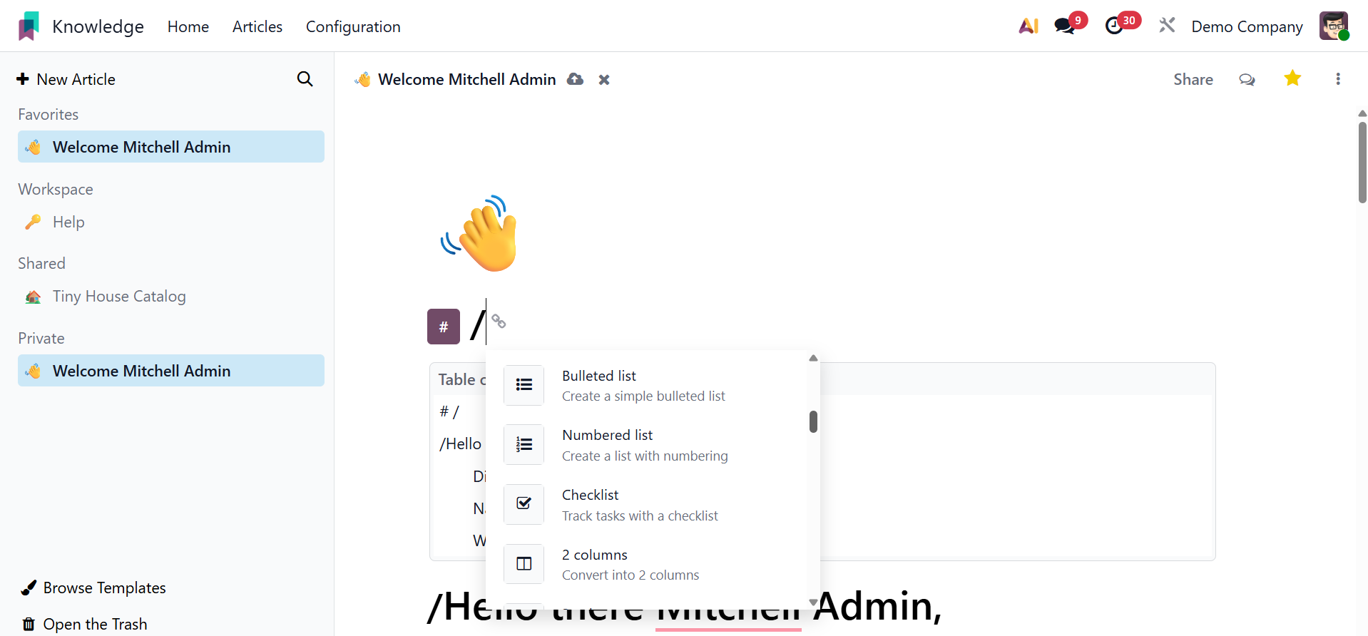 Users can include a variety of structures with the / attached, such as a bullet list, numbered list, checklist, table, quotation, separator, and columns, as shown in the image below.