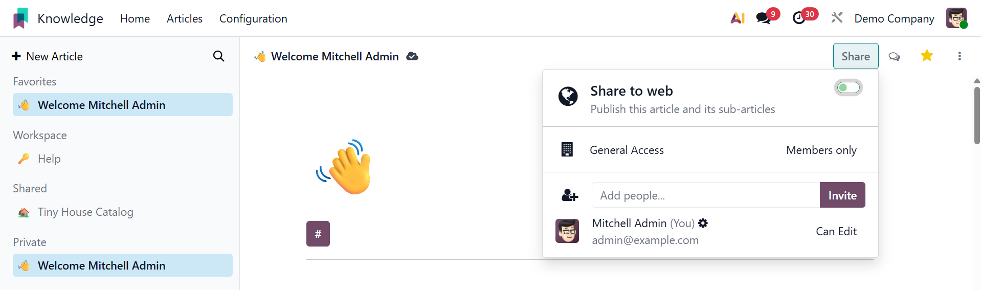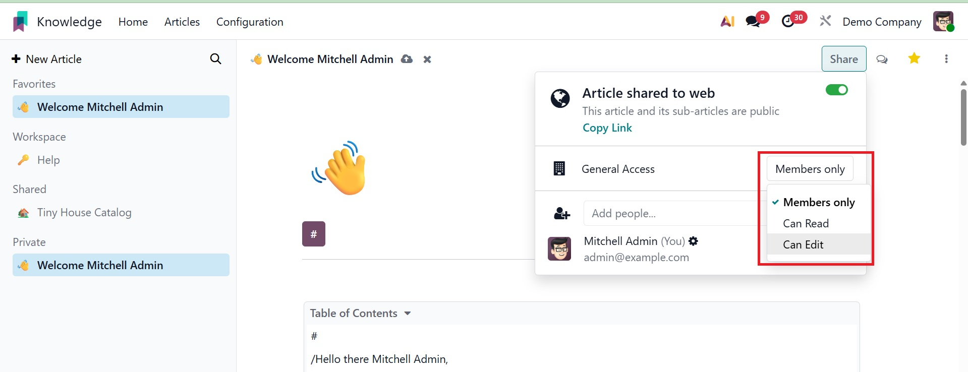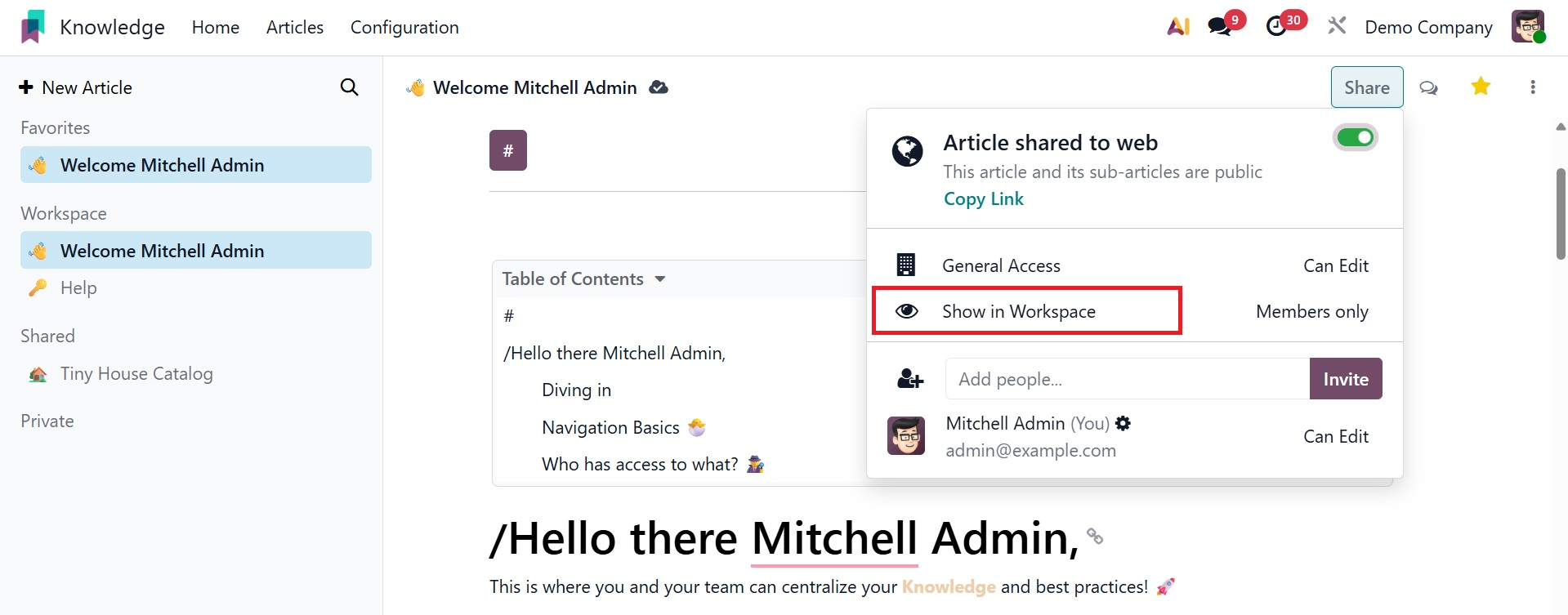 To manage who can view and edit articles, default access rights and show in workspace settings work together. "Members" or "Everyone" might be the visibility. You can make the item available to everyone by publishing it on the website and activating the Share to Web feature.