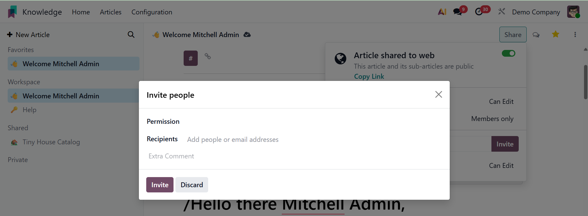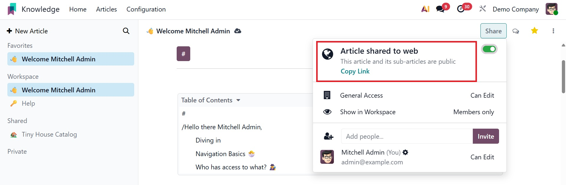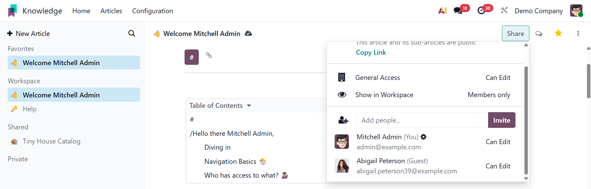 To manage who can view and edit articles, default access rights and show in workspace settings work together. "Members" or "Everyone" might be the visibility. You can make the item available to everyone by publishing it on the website and activating the Share to Web feature.