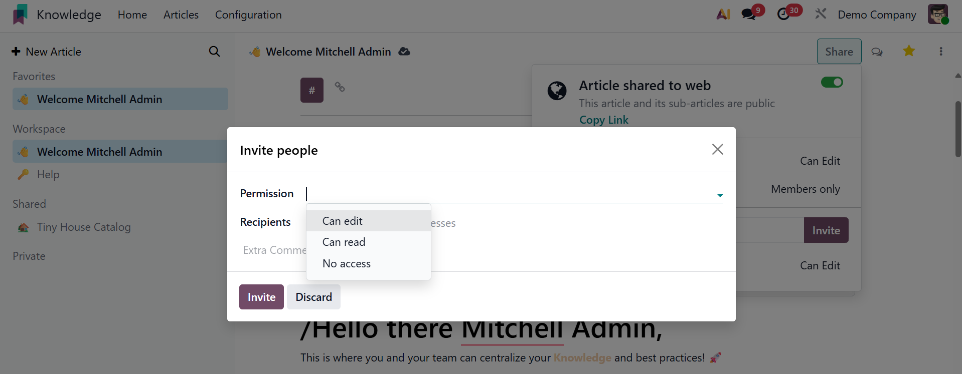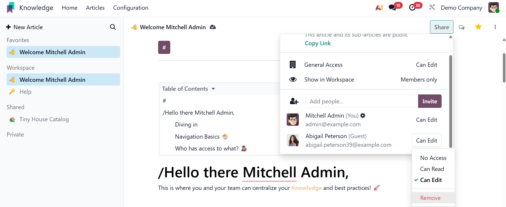 You can configure someone's access rights when you invite them. You can check the Can Read option in the Permission column to just permit reading access and prohibit modification of any type. Users will be able to read and edit the article if they choose the Can Write option. If the aforementioned individuals choose the No Access option, they will not be able to read or change this page.