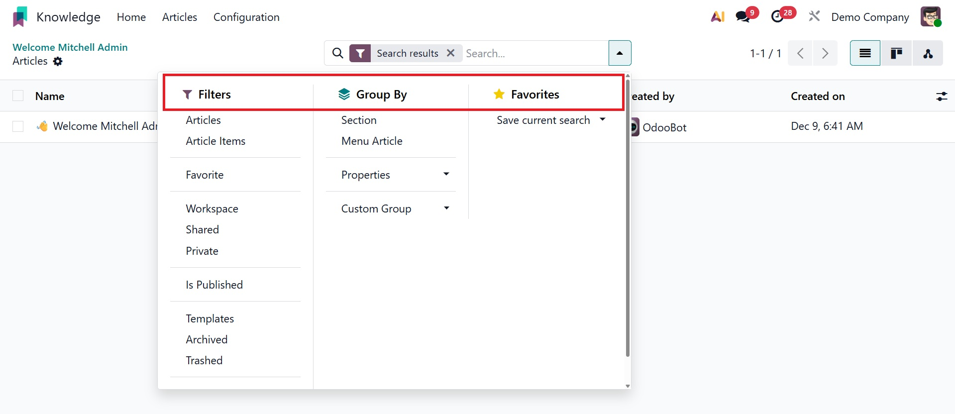 To locate articles, utilize the search bar. Article Items, Favorite, Workspace, Shared, Private, and Trashed are some of the article filters. By selecting the Add Custom Filter button, you may also add more than one custom filter to the articles. The default Group By option can be used to organize the articles by Section and Menu Article. To give articles a custom grouping option, click the Add Custom Group button.