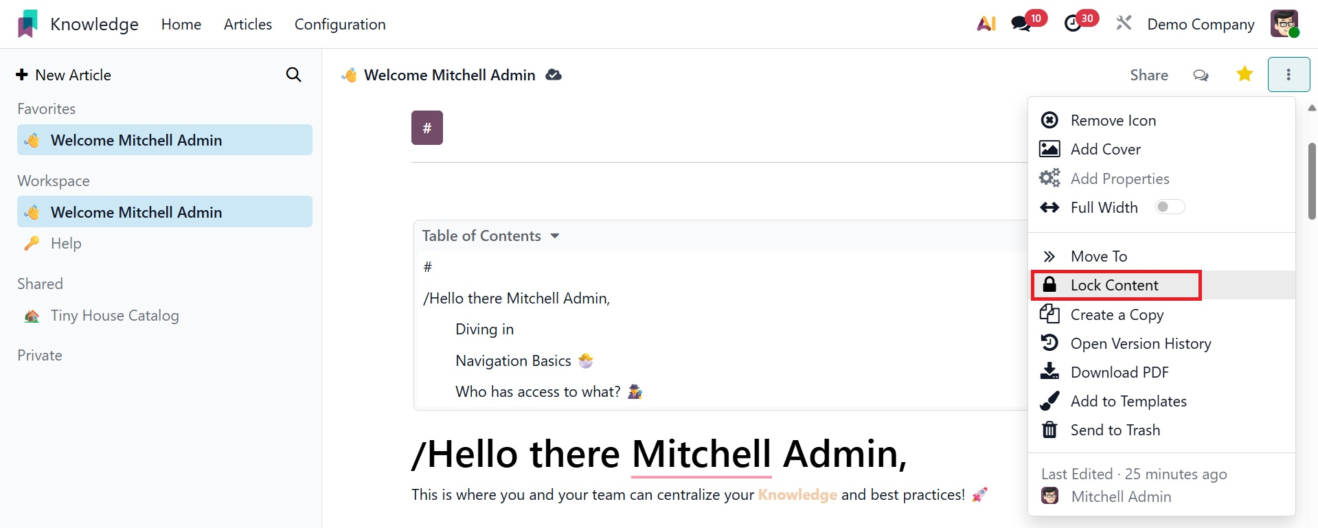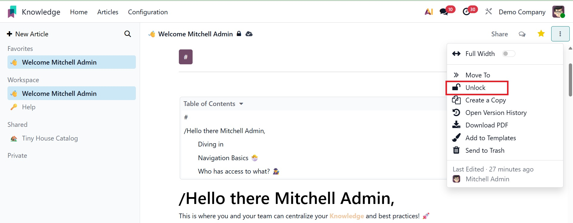 To protect your content, select the Lock option. A locked article cannot be edited in any way using Odoo19. These items can be unlocked by using the Unlock button.