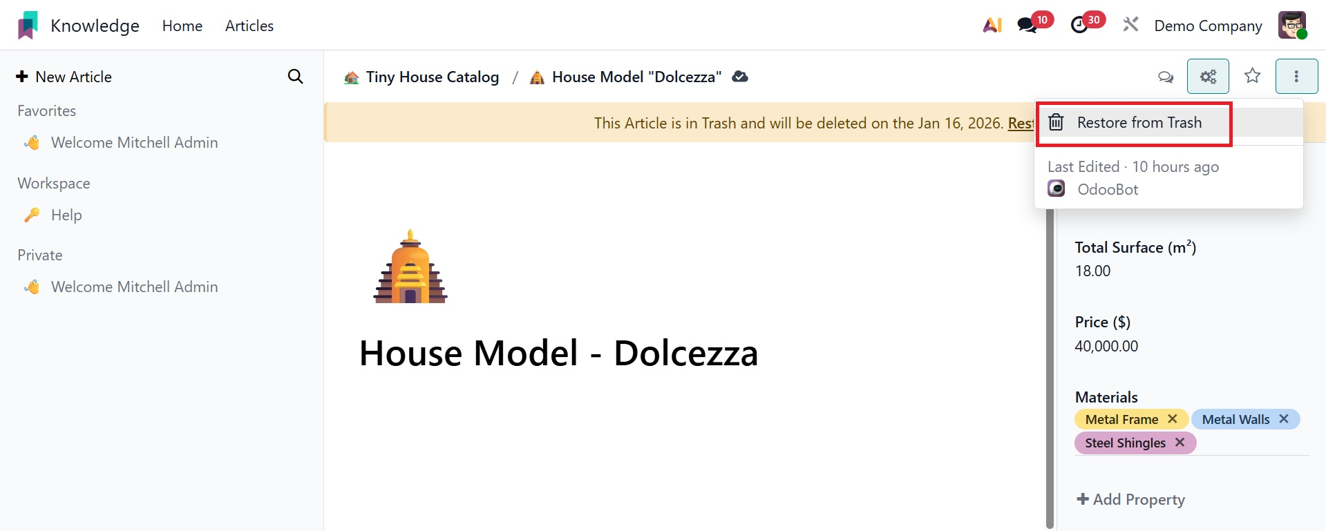 Odoo19 will retrieve the material if the "Restore from Trash" option is selected.