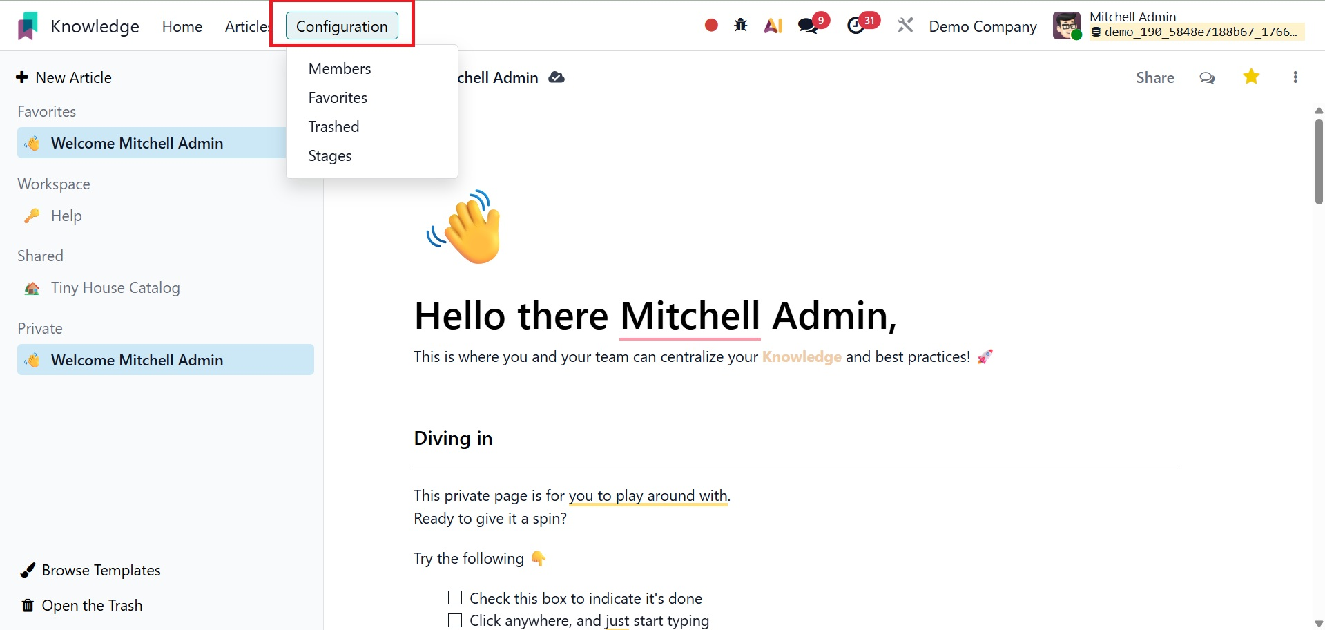 Teams may monitor the lifecycle and publishing status of knowledge articles by creating and managing article stages (such as Draft, In Review, or Published) using the Stages option under the Odoo 19 Knowledge module's Configuration menu.