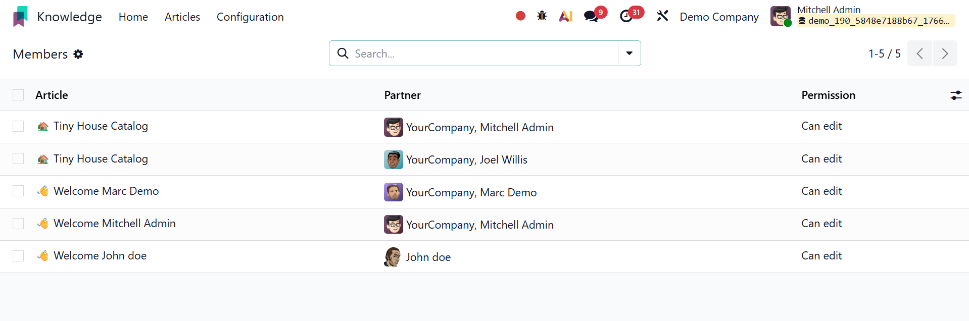 Administrators can regulate who can see, produce, modify, or manage documents within the Knowledge workspace by using the Members option under the Configuration menu of the Odoo19 Knowledge module.