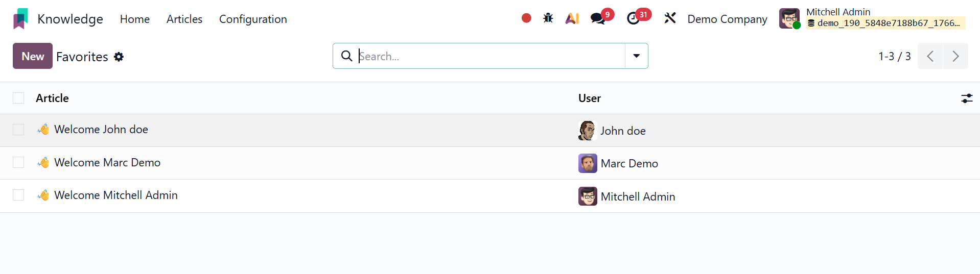 Users can improve navigation efficiency and productivity inside the Knowledge workspace by marking, organizing, and quickly accessing frequently used knowledge articles using the Favorites option found in the Configuration menu of the Odoo Knowledge module.