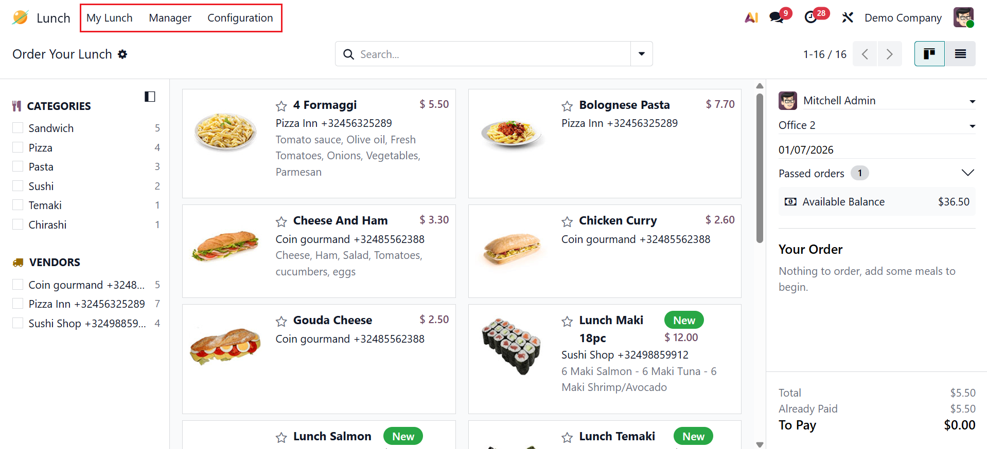 In the Lunch module, you can see three menus: My Lunch, Manager, and Configuration.