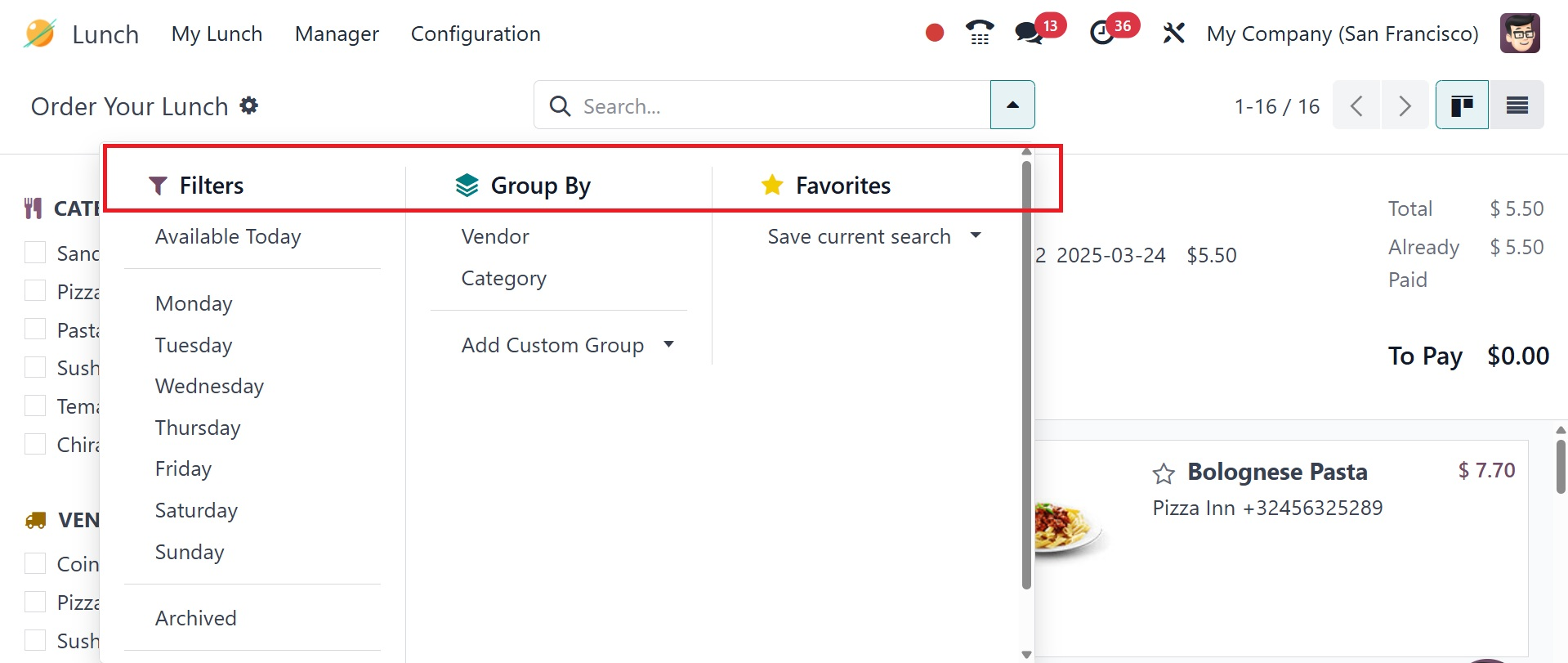 Click on the drop-down menu in the search bar to view options such as Filters, Group By, and Favorites. You can filter the lunch module based on Available Today, Monday, Tuesday, Wednesday, Thursday, Friday, Saturday, Sunday, and Archived. You can group the lunch module based on Vendor, Category, and Add Custom Group. You can also save the searches for future use. You can change the view from the Kanban to the List view.