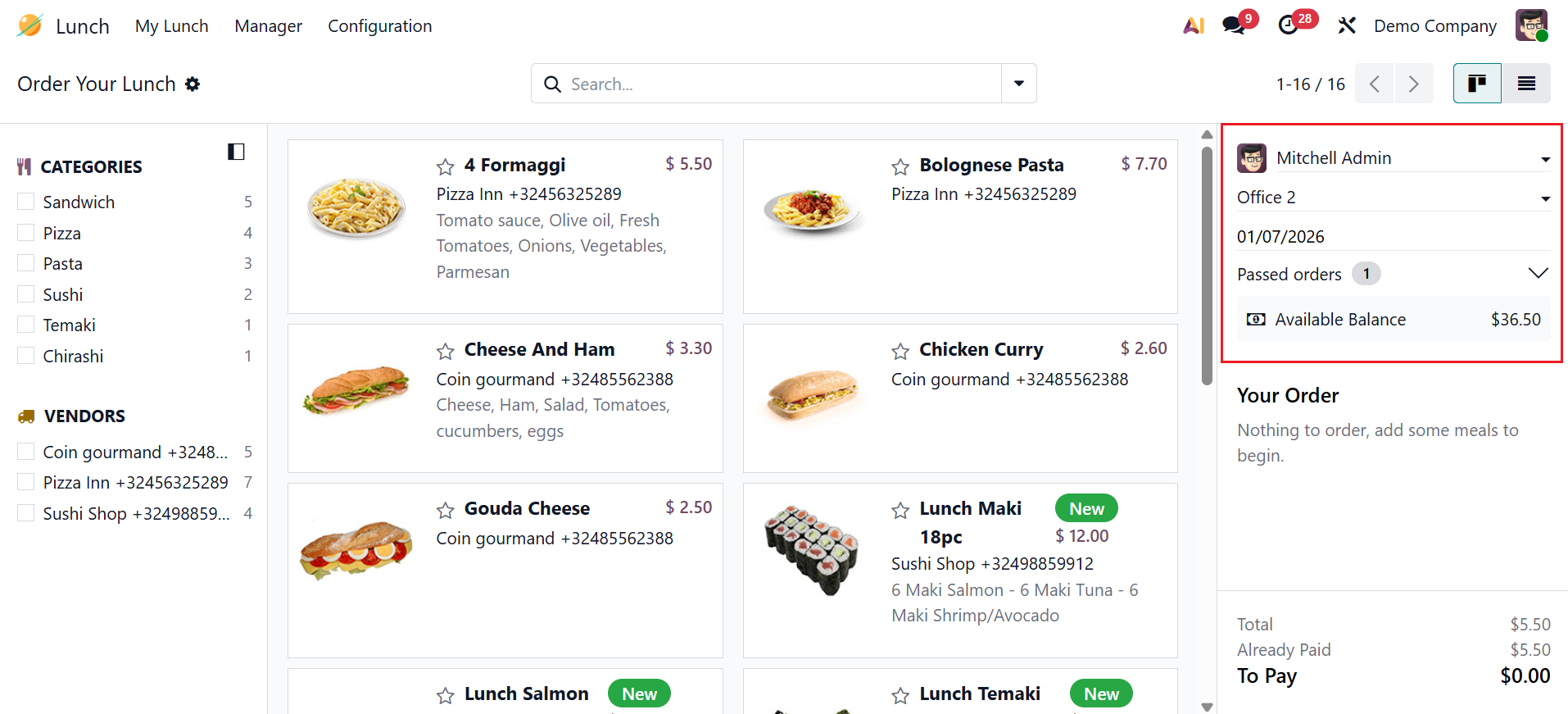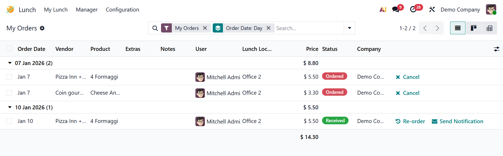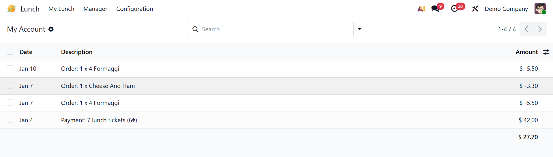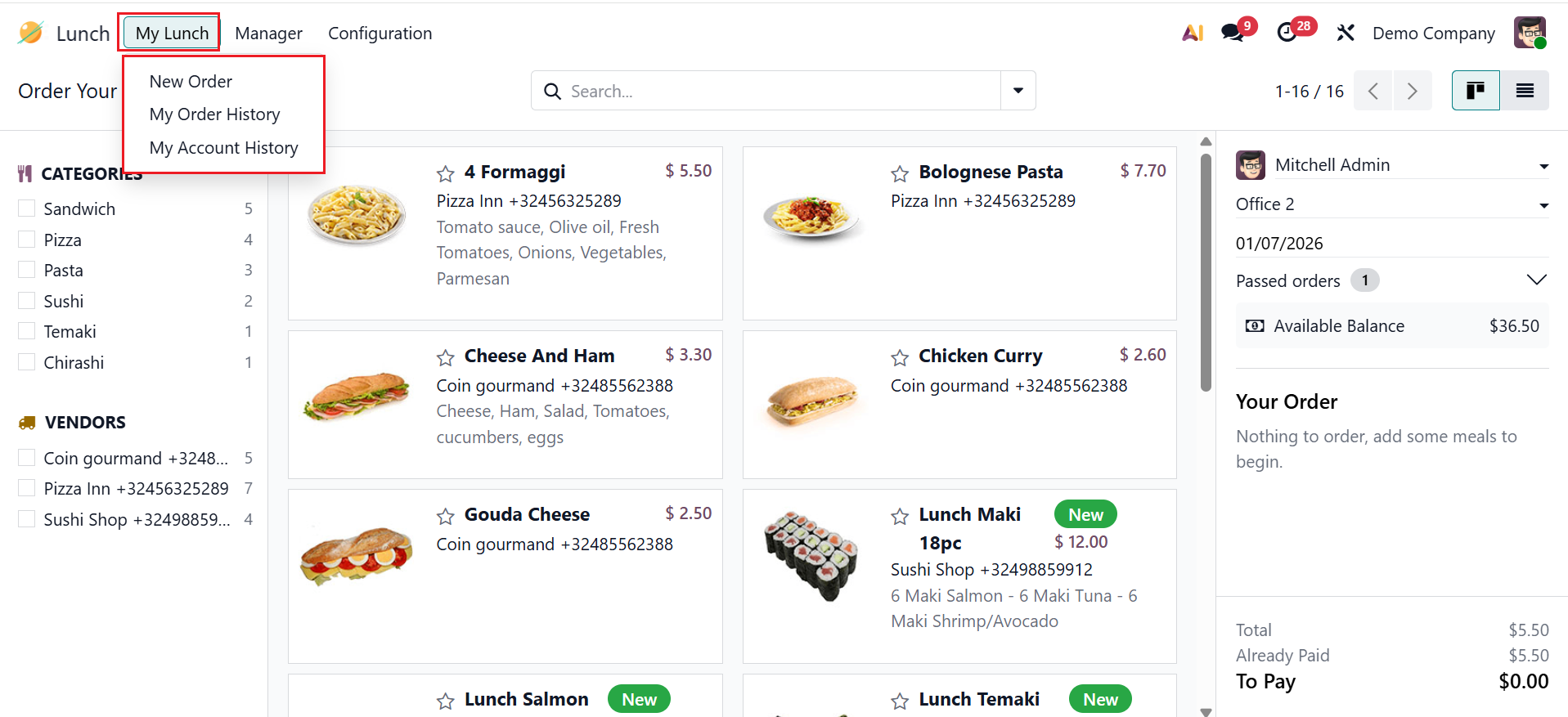By default, My Lunch menu is the main dashboard of the Odoo 19 Lunch module. Here, the employees can order and manage their personal lunch orders. From the My Lunch menu, you can access New Order, My Order History, and My Account History.