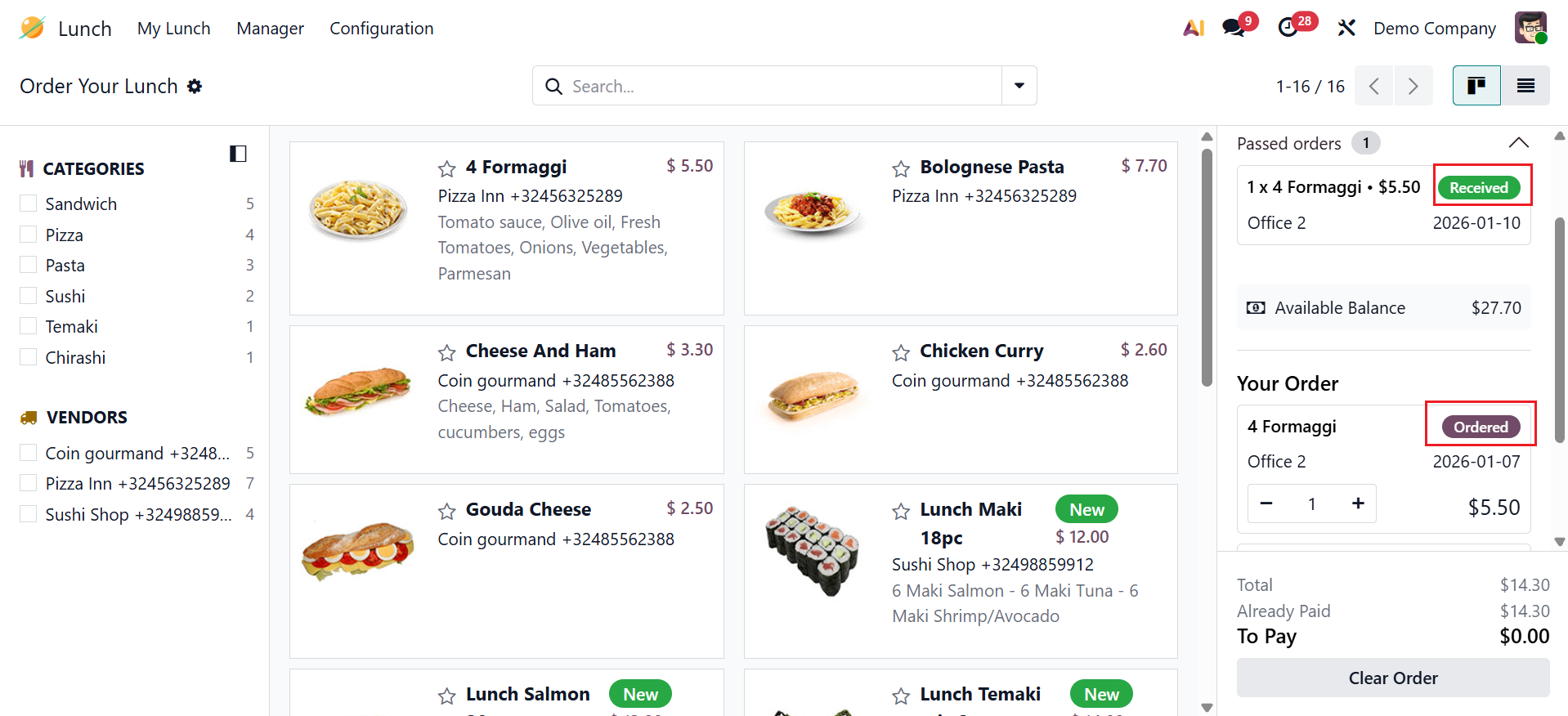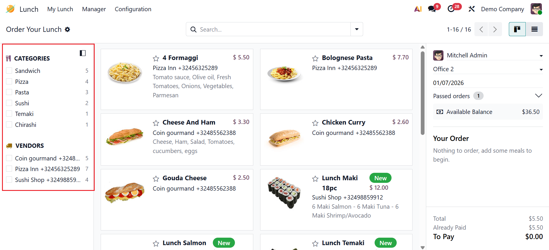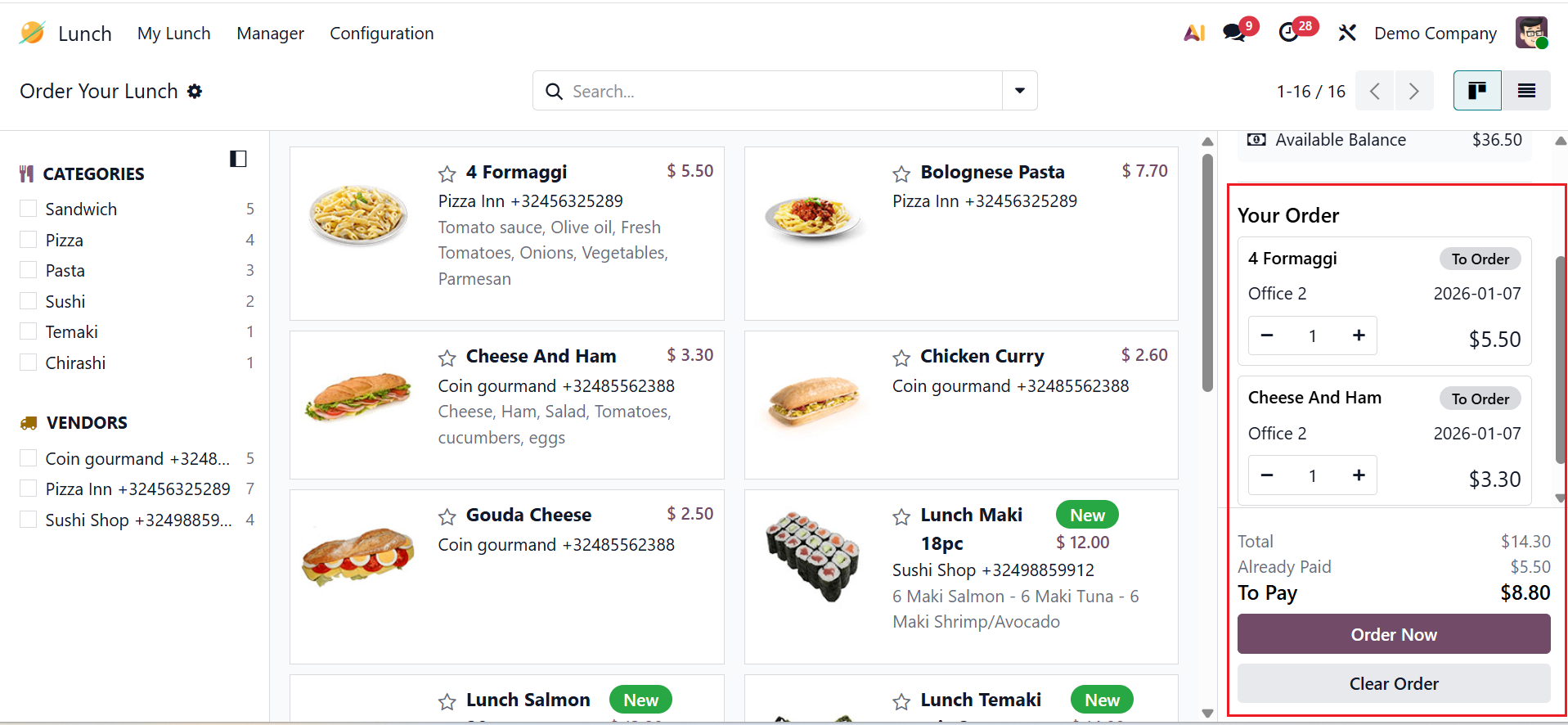 By default, My Lunch menu is the main dashboard of the Odoo 19 Lunch module. Here, the employees can order and manage their personal lunch orders. From the My Lunch menu, you can access New Order, My Order History, and My Account History.