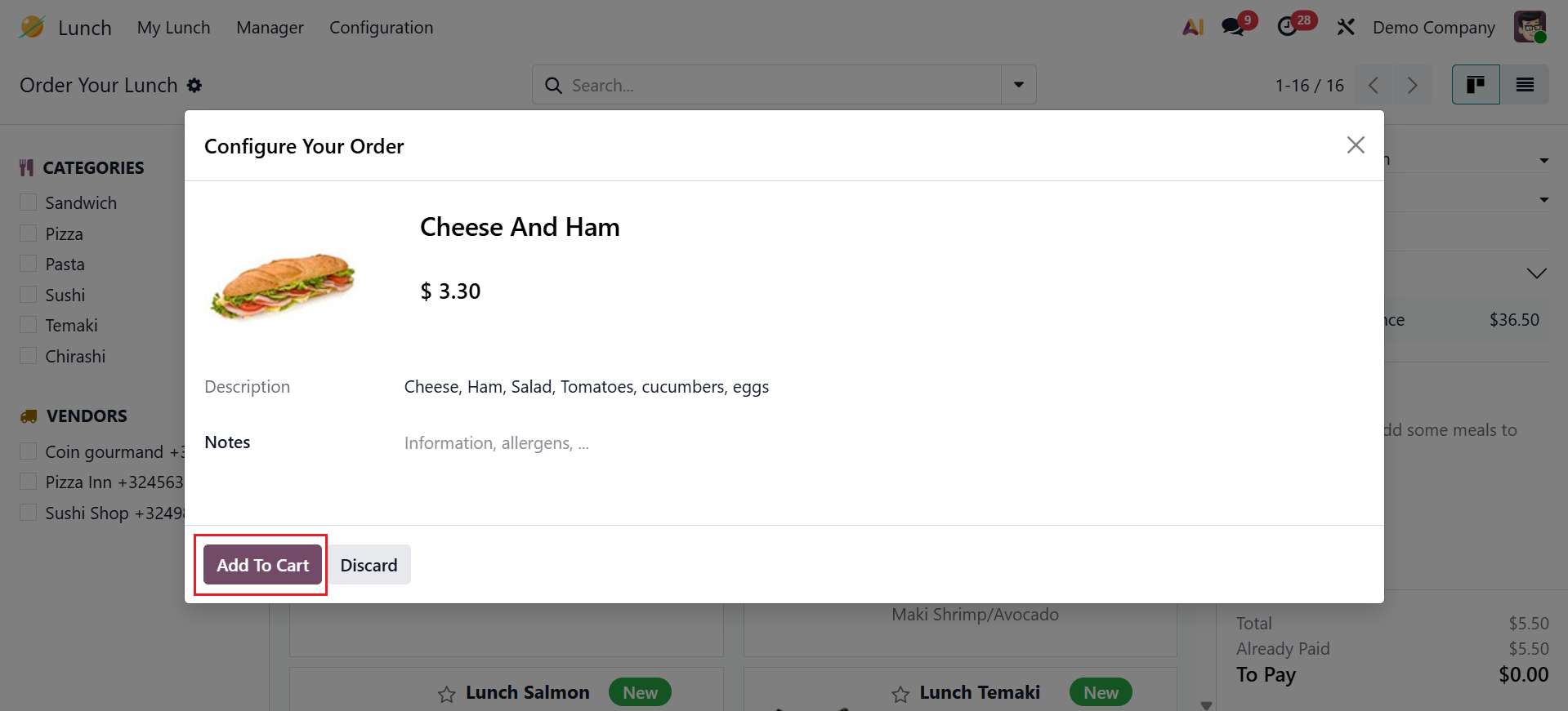 You can see the food items are arranged as cards, including details such as vendors, ingredients, and price. To configure an order, click on the specific food item. A pop-up window will then appear, as illustrated below. There, you can view the selected product's details, and you can add any extra information in the Notes field. To place the item in the shopping cart, click the Add to Cart button.