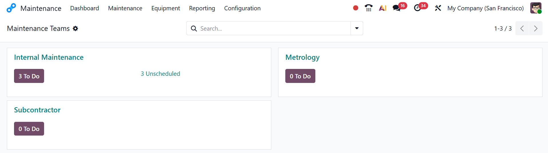 Here, you can see three maintenance teams, where each team has its own section and task counters: