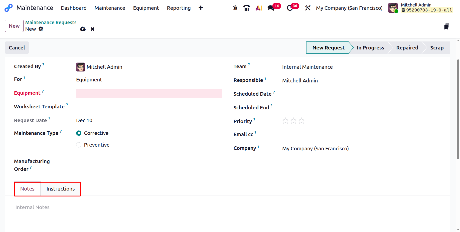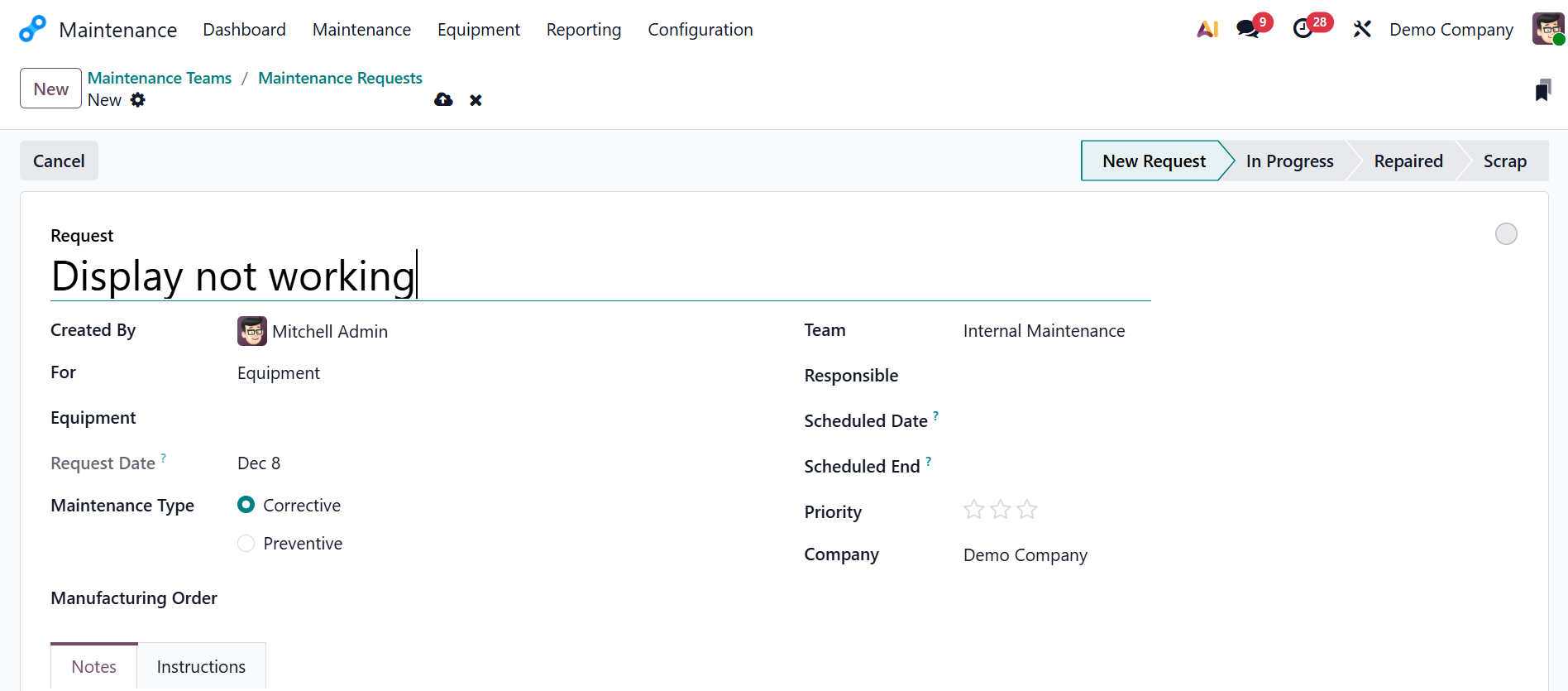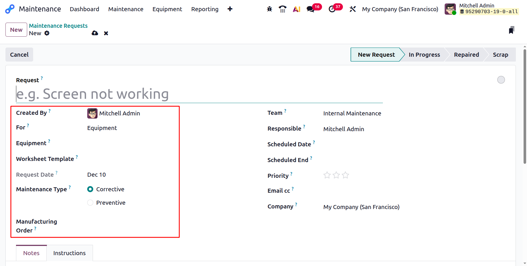 Here, you can view two tabs: Notes and Instructions. In the Notes field, add short information about the maintenance request.