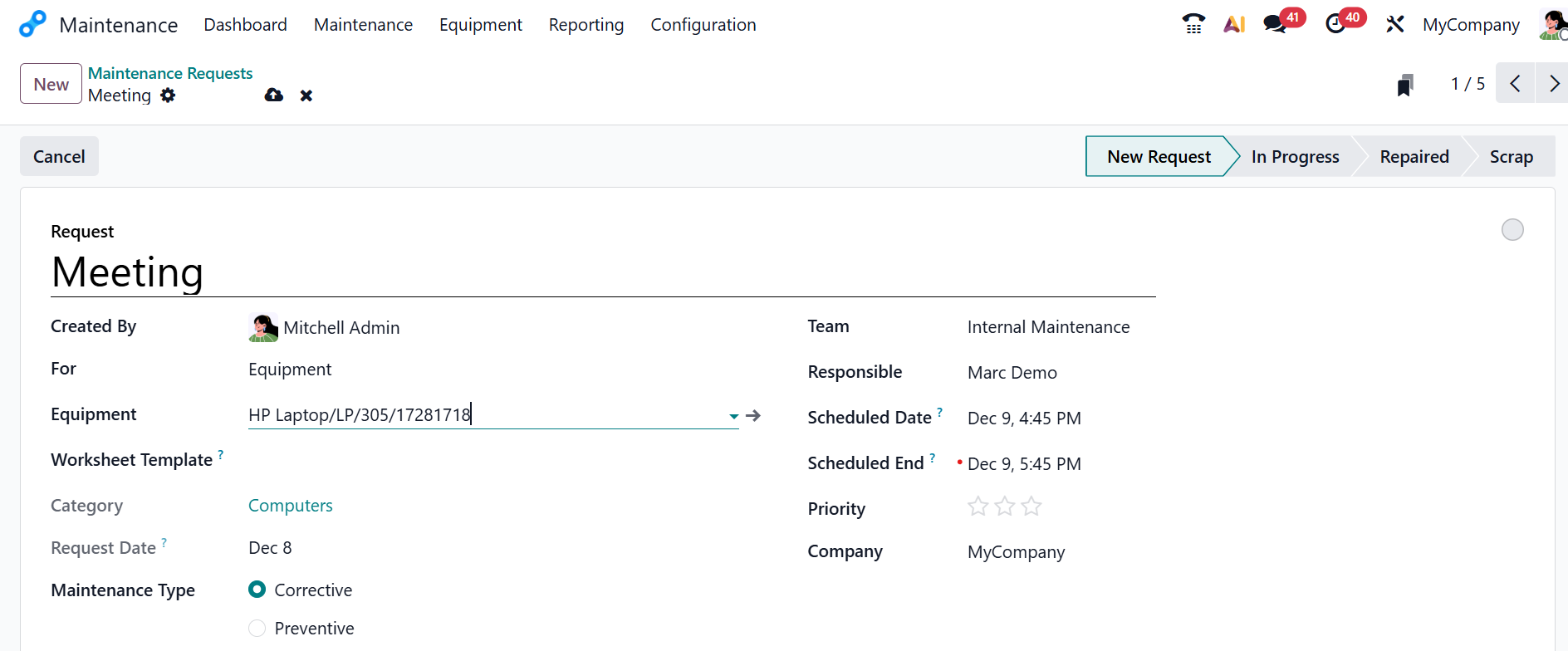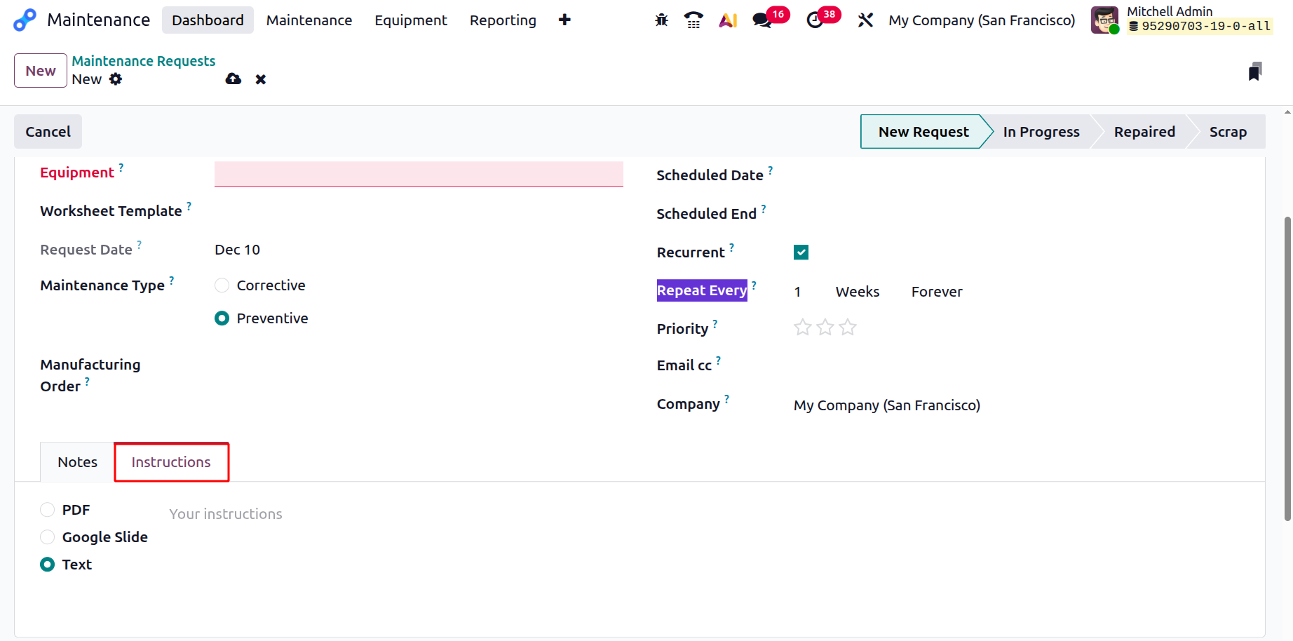 When you select the Maintenance Type as Preventive, you can view two additional fields: Recurrent and Repeat Every. Enable the Recurrent field to automatically create the same maintenance request. In the Repeat Every field, you can add how often the request should be repeated. After all the details are added, the maintenance request will move through the In Progress, Repaired, and Scrap stages.