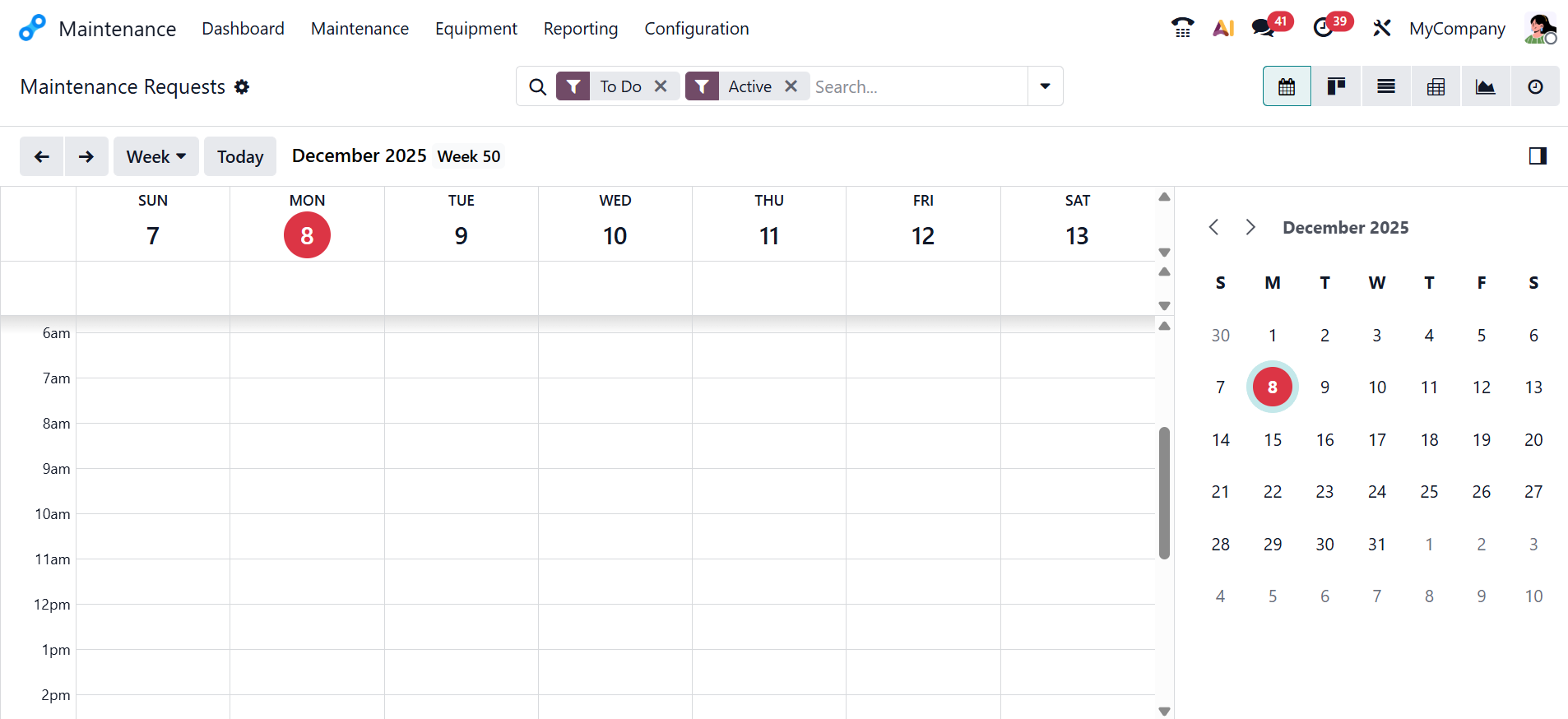 The Maintenance menu is the central place to manage all maintenance requests and maintenance activities in Odoo 19. You can use it to track machine health, manage requests, and oversee task progress. You can view two options under Maintenance Requests: Maintenance Requests and Maintenance Calendar.