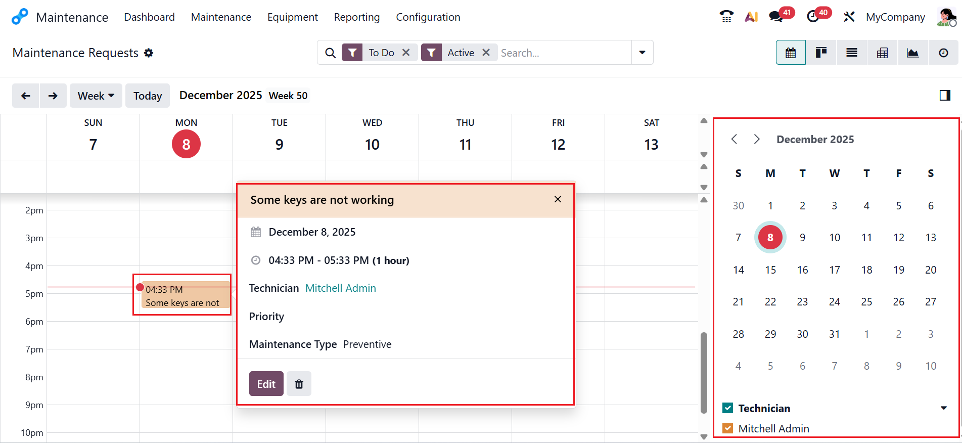 Once an event is created, use the Edit button to modify it. Then, you will move to the new window where you can view details of the maintenance request as shown below: