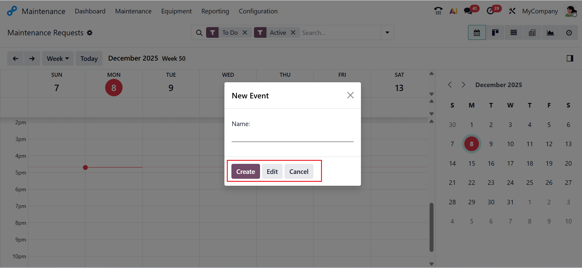 Here, you can create a new maintenance request by selecting a date from the calendar view. A pop-up screen will appear, and there you can add an Event Name and click on the Create button.