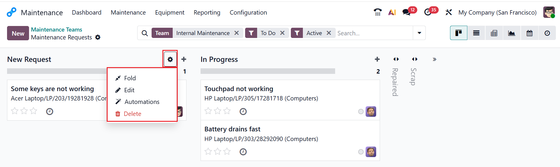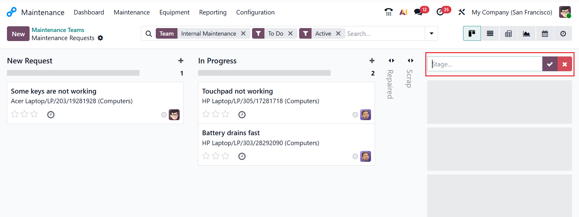 Click the To Do button for each maintenance team to view all maintenance requests. By default, the maintenance requests can be viewed as Kanban. You can also change it into List, Pivot, Graph, Calendar, or Activity views. You can also see that the maintenance requests are in different stages, such as New Request, In Progress, Repaired, and Scrap, as shown below. To create a new stage, click >>Add Stage, then enter a title.