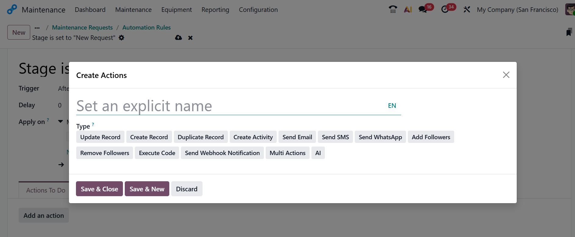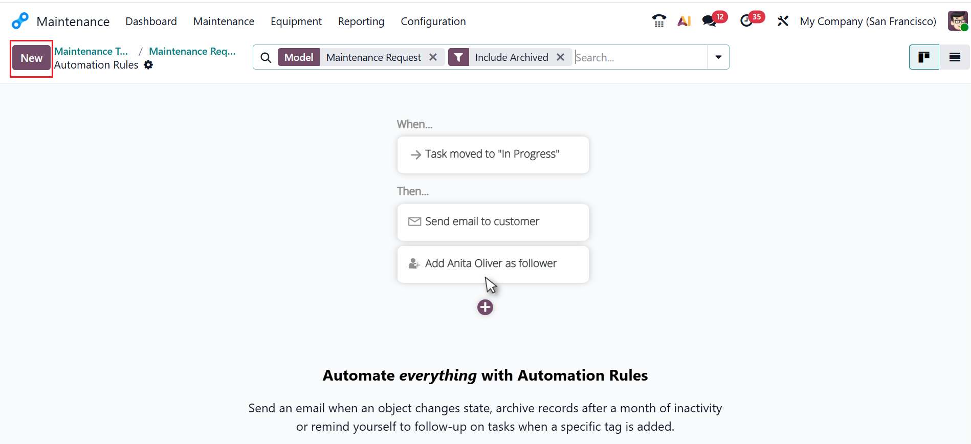 Stages of maintenance requests can be automated according to preset rules and specifications. Click the Automations button to open a new window, then click New button as shown below.