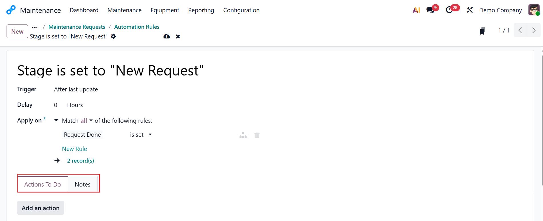 Use the new window to create a rule and specify conditions. The automation rule's title will be automatically updated. You can set an appropriate Trigger action. In the Delay field, you can set the time to upgrade to the new stage after the last update. In the Apply On field, you can select a condition to specify stage automation based on your rules or filters by clicking the +Add Condition button. Here, I've chosen a simple rule in this example as the "Request Done" column is “set.” You can view two tabs: Actions To Do and Notes.
