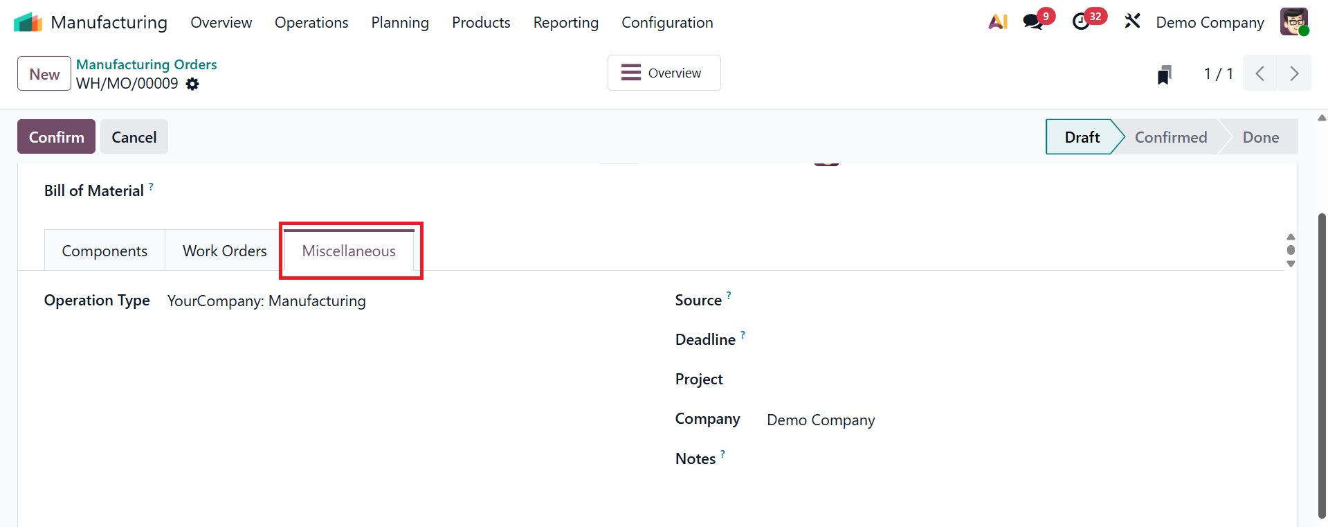 We can offer further information about the work order on the Miscellaneous area once everything has been finalized. The Miscellaneous tab allows you to identify Operation Types, Projects, and the Company, as well as add more details like Sources, deadline, project, company, and notes .