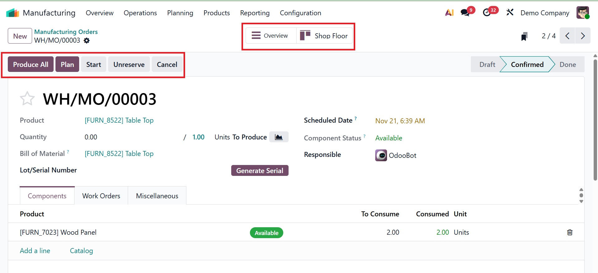 Once all the information has been entered, save the work order details and use the "Confirm" option to move forward with the work order. A new manufacturing order will be created as a result of this action, and some key buttons and smart button options for subsequent operations are displayed below.