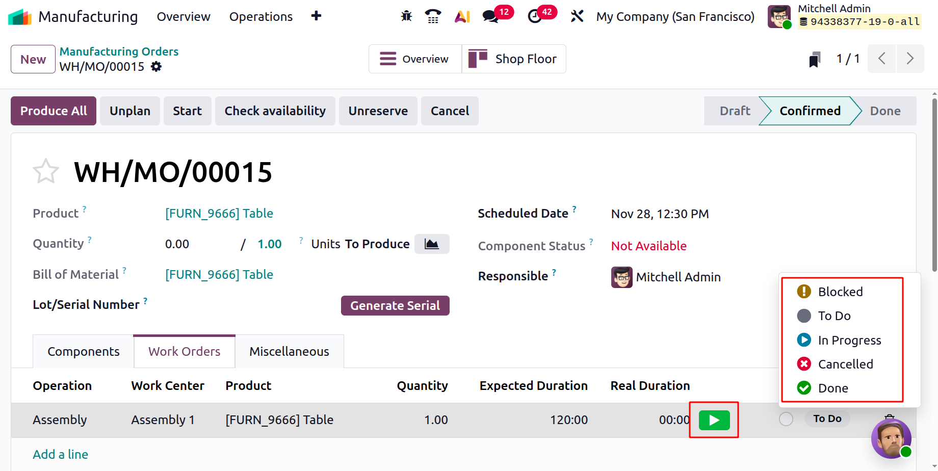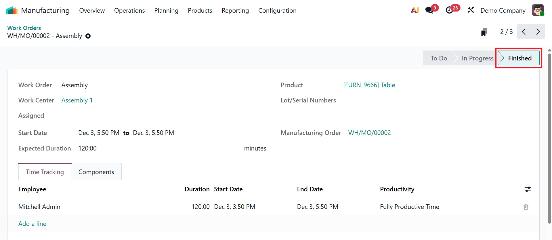 - Mark as Done – Confirms that the work order has been fully completed and updates the manufacturing progress accordingly. Once you select the option, the status will be moved to Finished.