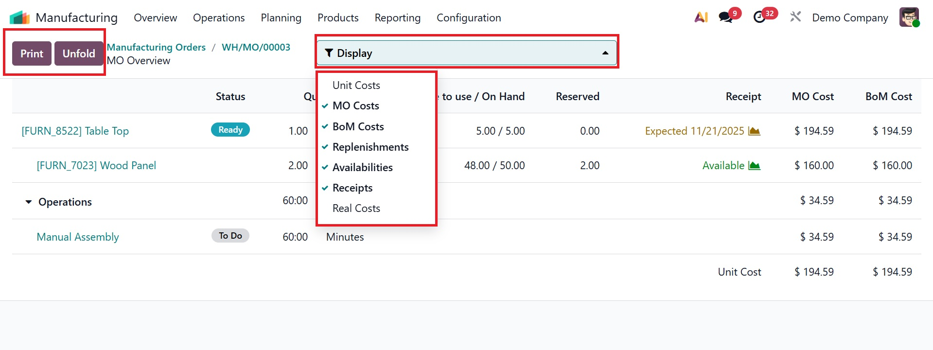 We can print the data using the Print button for further research or to better comprehend the processes. You can add or remove MO Cost, Real Cost, BOM Cost, Unit Cost, etc. from the MO Overview using the display filter. If there are any errors or problems with the product's quality, Odoo will show a "Unbuild" button after creating the manufacturing order.