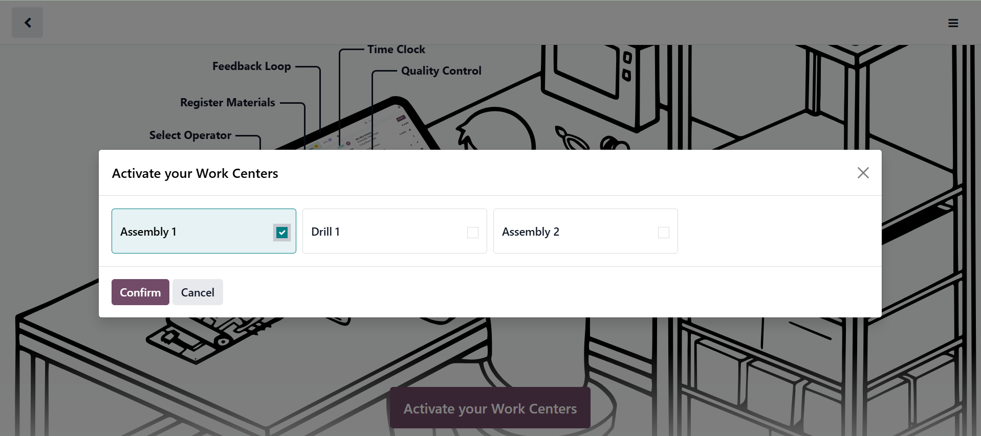The manufacturing order's work order tablet view will be displayed under the "Shop Floor" tab. Thus, you must select and verify the work center for this station.