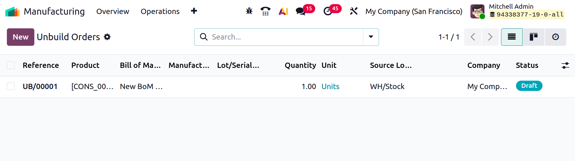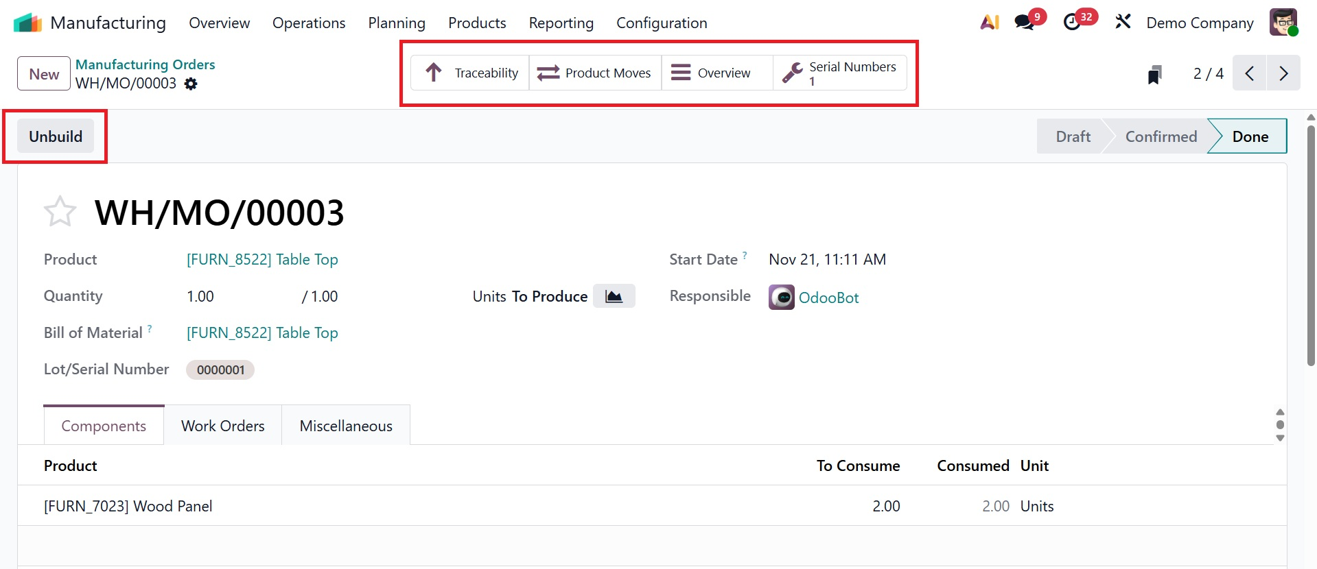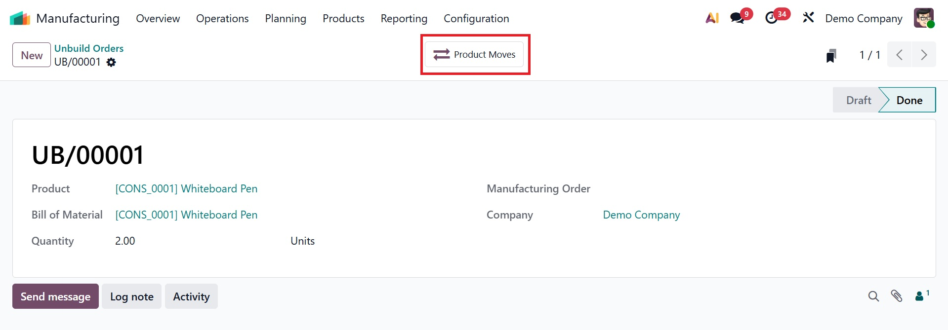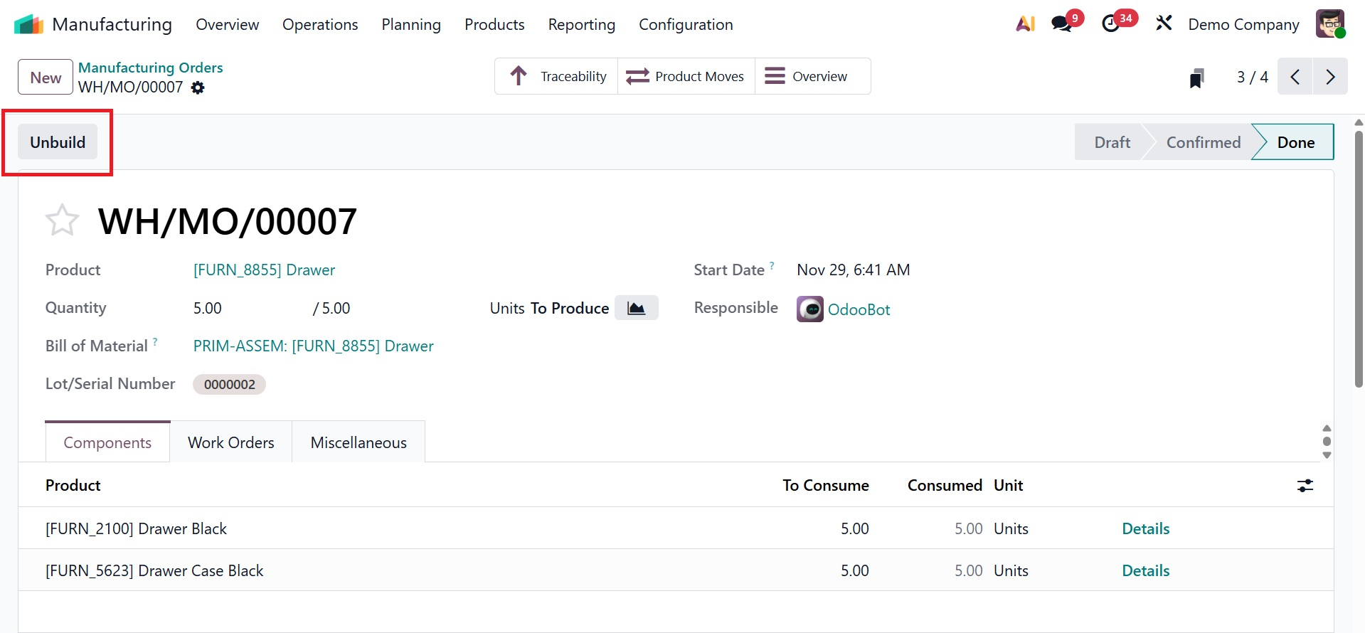 Even after a typical manufacturing order is completed, you can make use of the unbuild capabilities. By choosing the "Unbuild" button on the manufacturing order form, as shown below, you can swiftly reverse the process if the final product is defective or damaged after all production procedures have been concluded. Consequently, the system can disassemble the finished product and properly put the pieces back into stock.