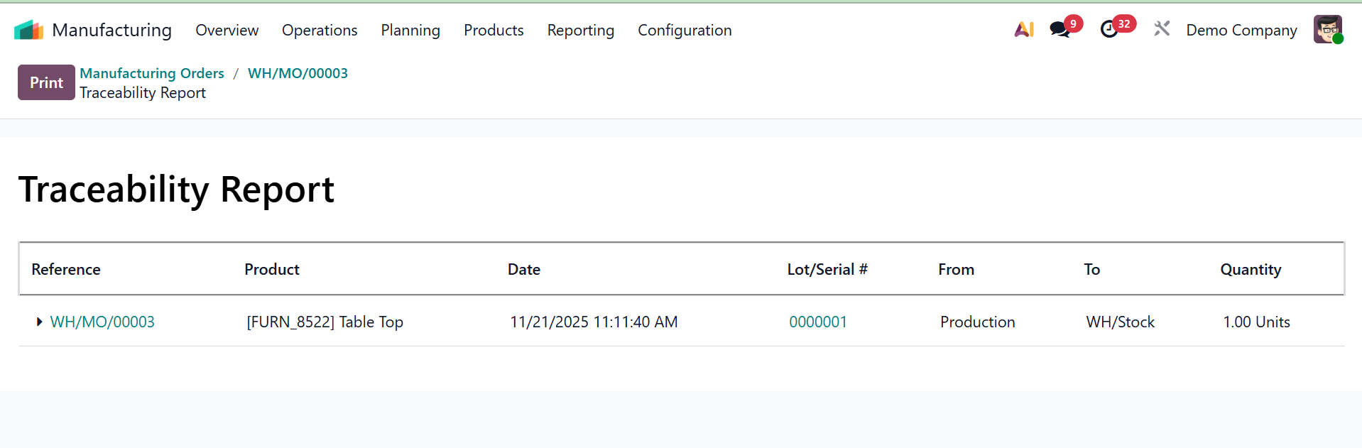 You can view the product traceability report by using the "Traceability" smart button. This report contains comprehensive details on each product that was included in the manufacturing order, as can be seen in the image below.