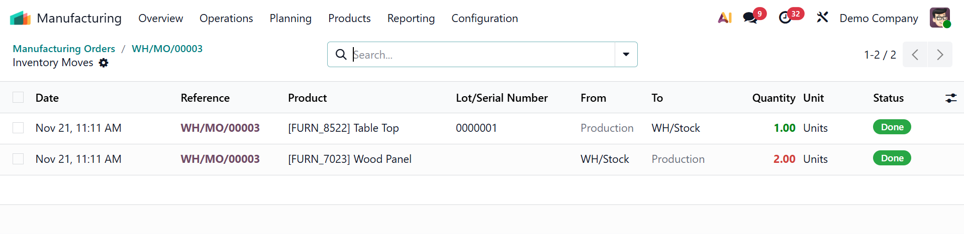 Clicking the "Product Moves" smart button will bring up a dashboard with all inventory movement data, including the time and location of a component or product transfer across facilities. In this example, several parts were moved to ensure stock availability.