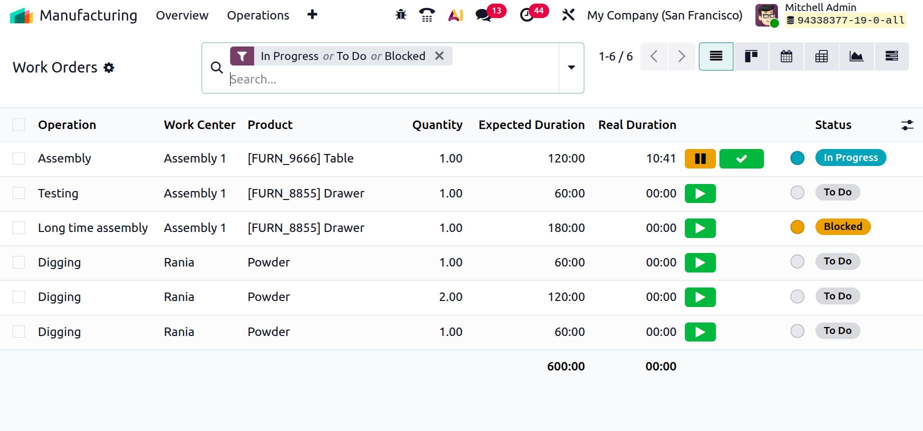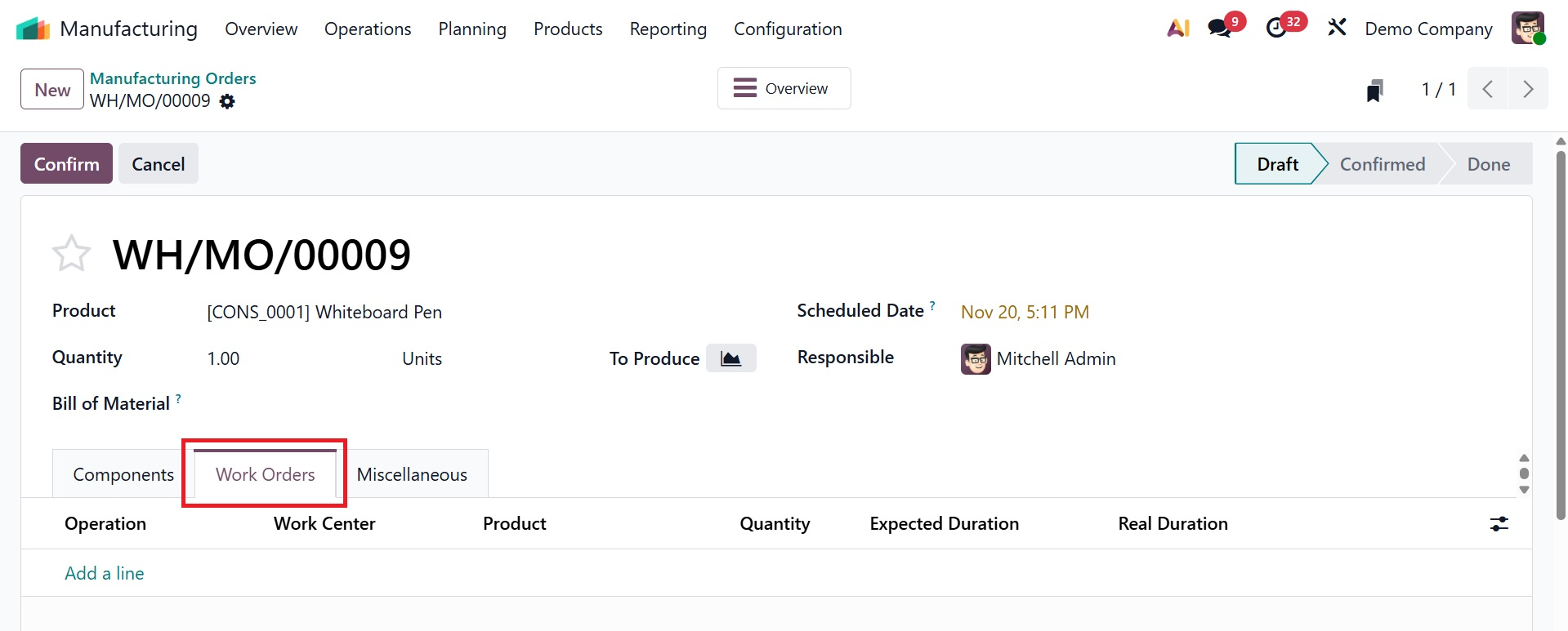 he operation, work center, product name, quantity scheduled to begin, expected duration, and actual duration can all be added under the Work Orders tab option. How the real-time is automatically adjusted will depend on the jobs involved in the manufacturing process.